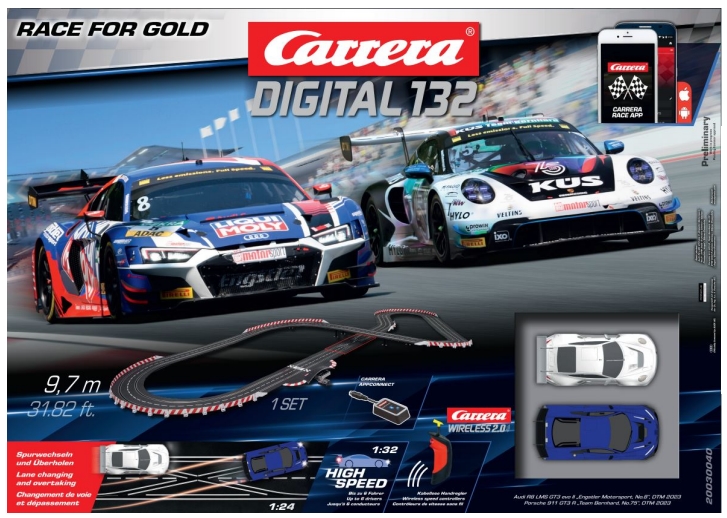 Digitale Rennbahn garantiert Rennspaß für bis zu 6 Fahrer gleichzeitig ~ Extra breite Schienen im Maßstab 1:24 ~ OriginalgetreueFahrzeuge im Maßstab 1:32 mit Frontlicht und Rück-/Bremslicht ~ Ghost- und Safetycar-Funktion ~ Auf Knopfdruck FullspeedSpurwechseln und Überholen ~ Steuerung über neue WIRELESS 2.0 Handregler