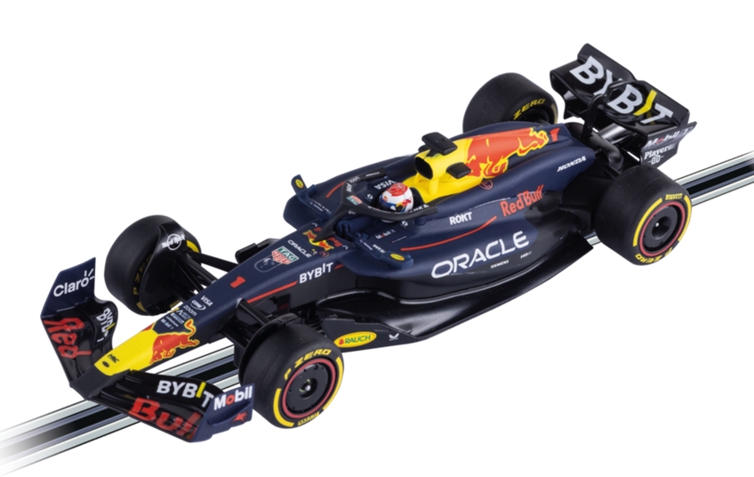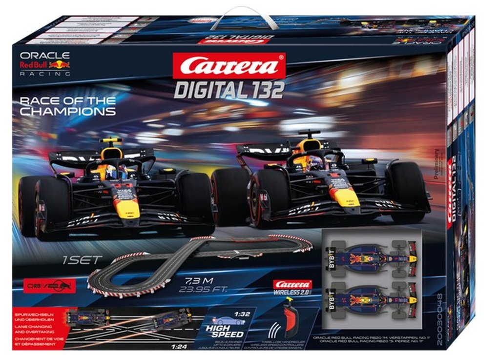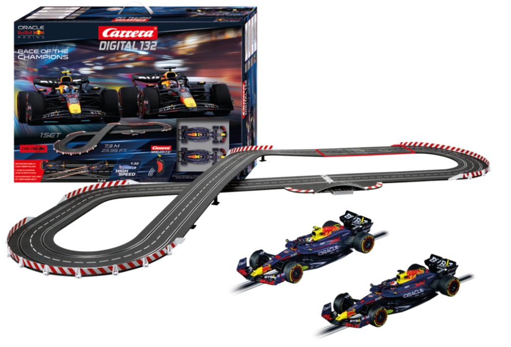 Lieferumfang: Red Bull Racing RB20 M.Verstappen, No.1Red Bull Racing RB20 S.Perez, No.11CONTROL UNIT, 2 WI RELESS 2.0 Handregler, WIRELESS 2.0 Empfänger, Doppelweiche, Geraden, Kurven, Leitplanken; Streckenlänge 7,30m