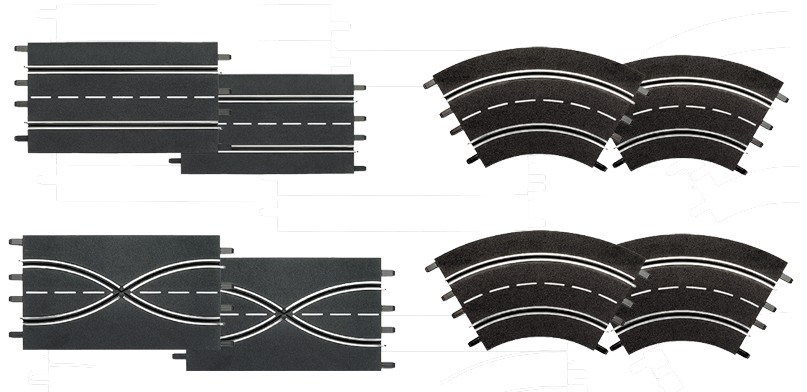 Packungsinhalt: 2 Stück Standardgeraden, 2 Stück Spurwechselstücke, 4 Stück Kurven 1 / 60 Grad und Bahnstückverriegelungen