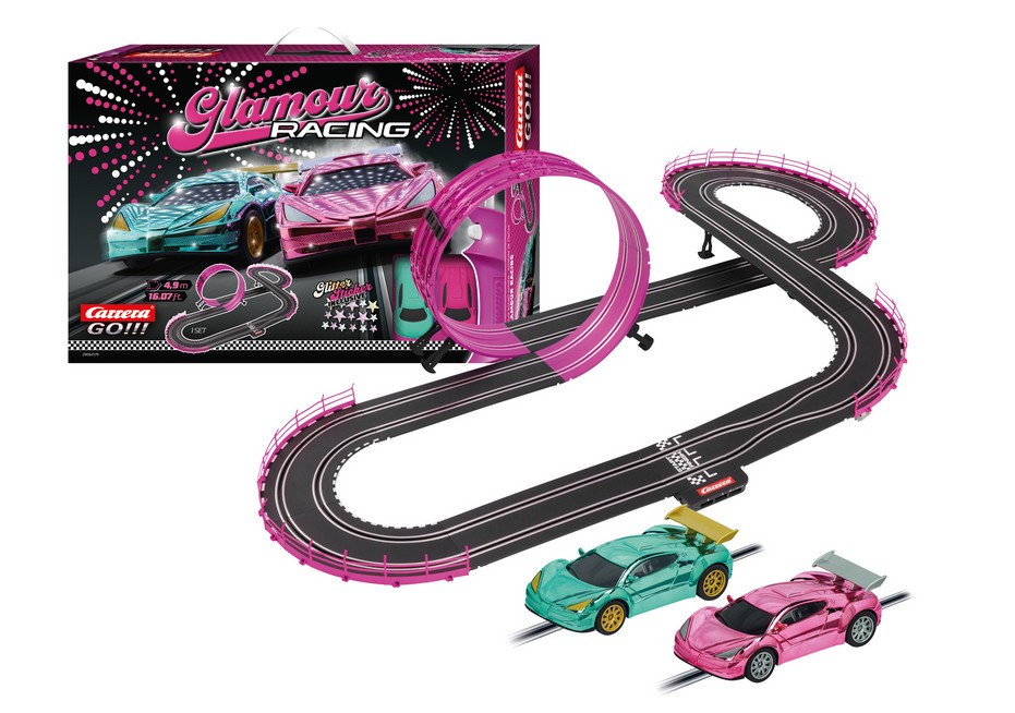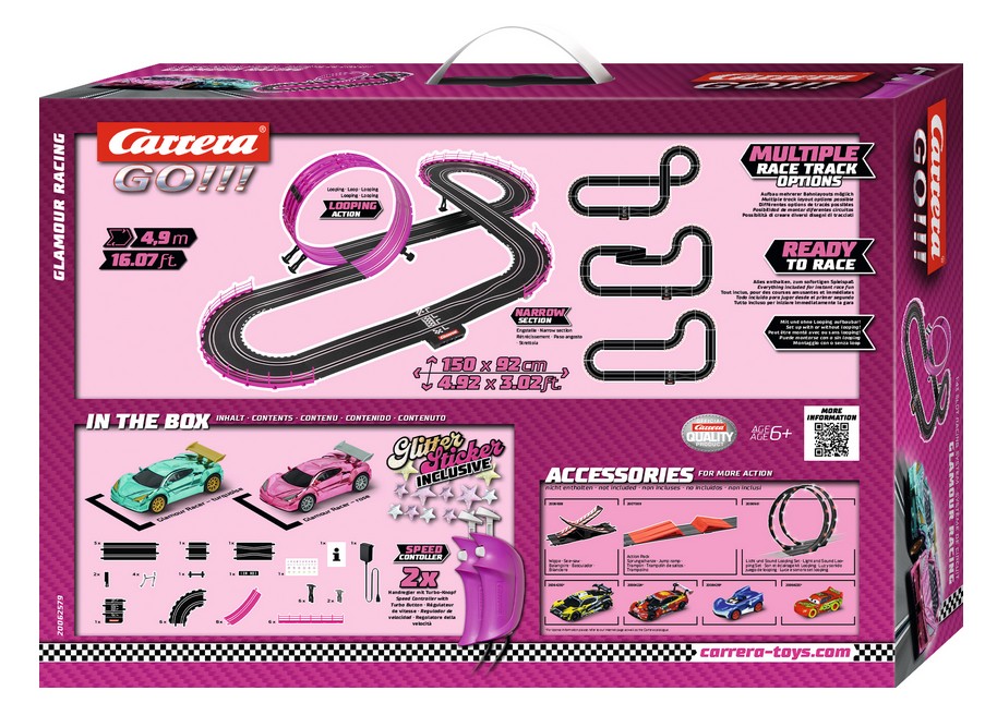 ~FHighspeed Action in Glamour Style!~fMit dem neuen ~FCarrera GO!!! "Glamour Racing~f"-Set tauch en die jungen Pilotinnen in ein atemberaubendes Racing-Abenteuer ein. Das Set, gestaltet mit coolen pinken Elementen, lässt besonders Mädchen-Augen leuchten, wenn sie die glamourösen GT-Fahrzeuge über die Strecke steuern und dabei Höchstgeschwindigkeiten erreichen. Die Fahrzeuge beeindrucken durch i hre einzigartigen Farben und glänzen in coolem, metallischem Pink und Türkis - ein echter Hingucker auf der heimischen Rennstrecke. An der Startlinie klopfen die Herzen, und los geht's auf die 4,9 Met er lange Carrera-Bahn. Der Nervenkitzel packt die Pilotinnen auf den Highspeed-Geraden, während sie durch die engen Kurven driften und mit einem mutigen Manöver den pinkfarbenen Looping meistern. Auch bei der Engstelle zeigt sich, wer wirklich das Zeug zur Rennfahrerin hat. Geschicklichkeit und Könn en sind gefragt, wenn die Fahrzeuge millimetergenau gesteuert werden und in spannenden Duellen gegen Freundinnen antreten. Das Set bietet Spannung pur und fordert die Fahrerinnen heraus, immer wieder ihr Bestes zu geben. Das Carrera GO!!! Glamour Racing-Set ist das perfekte Abenteuer für alle, die Spannung und Spielspaß auf der Rennstrecke suchen und sich in packenden Rennen mit ihren Freunden m essen wollen.