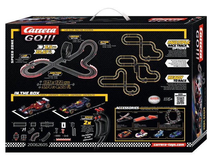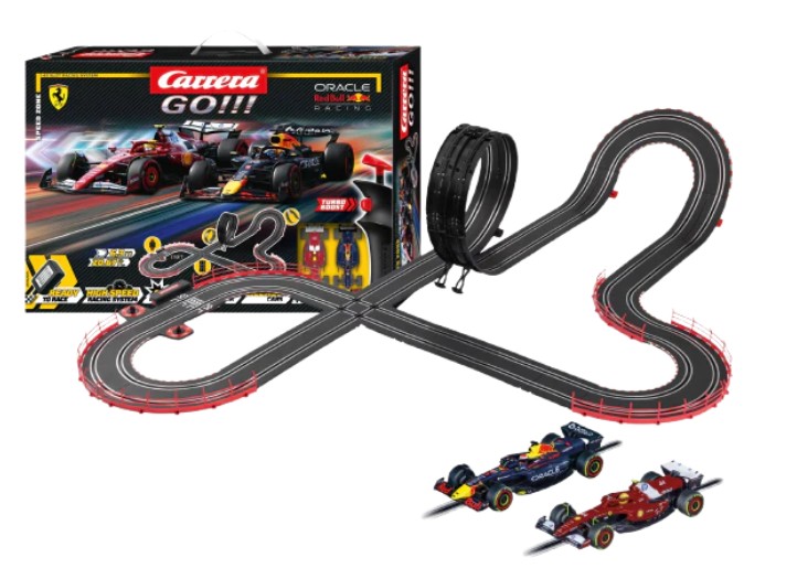 Im Carrera GO!!! Set Speed Zone treffen zwei der größten Ikonen des Motorsports aufeinander: Max Verstappen im Oracle Red Bull Racing RB21 "M. Verstappen, No.1" und Lewis Hamilton im Ferrari SF-25 "L. Hamilton, No.44". Auf der spektakulären 6,3 Meter langen Strecke zeigen die Rennfahrer ihr Können ? mit Highspeed-Geraden, scharfen Kurven und einem Looping sorgt die Rennbahn für adrenalingeladene Action. Detailgetreu gestaltete Fahrzeuge und abwechslungsreiche Streckenelemente holen die packende Atmosphäre der Formel 1 direkt ins eigene zu Hause. Jetzt heißt es: Gas geben und beweisen, wer der Schnellste auf der Strecke ist!