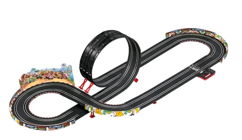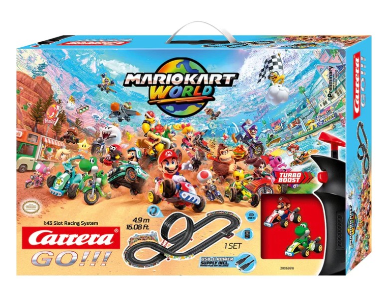 Das Carrera GO!!! Set "Mario Kart WORLD" bringt rasante Kopf-an-Kopf-Rennen nach Hause. Auf 4,9 Met ern Strecke liefern sich Mario und Yoshi in ihren originalgetreuen Fahrzeugen packende Duelle über K urven, Highspeed-Geraden und einen Looping. Die 1:43 Fahrzeuge sorgen für Fahrspaß für Kinder ab 6 J ahren und Erwachsene. Das Power Modul mit Rundenzähler, LED-Anzeige, verschiedenen Rennmodi, wählbar en Geschwindigkeiten und USB-C-Stromversorgung erweitert das Racing.