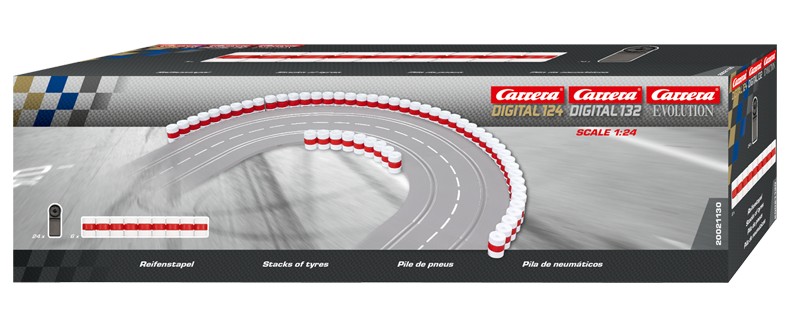 Mit den Reifenstapeln sorgst Du für mehr Sicherheit auf Deiner Carrera Bahn! Die Reifen stoppen außer Kontrolle geratene Slotcars und verhindern schwere Crashs und Unfälle. So werden nicht nur Fahrer und Auto geschützt, sondern auch Zuschauer und Streckenpersonal. Die Reifenstapel sorgen für ein noch authentischeres Ambiente und kommen im Maßstab 1:24 daher. Sie eignen sich also perfekt für die Carrera DIGITAL 124, Carrera DIGITAL 132 und Carrera EVOLUTION Rennbahn. Du erhältst 24 Halterungen und sechs Reifenelemente mit jeweils neun Reifenstapeln und drei Reifen pro Stapel. Die Reifenketten kannst Du an einer beliebigen Stelle einsetzen.