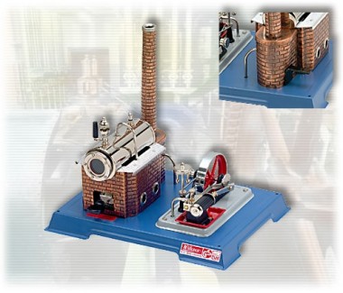 Messingkessel hochglanzpoliert und vernickelt, Durchmesser 45 mm, Länge 115 mm, Kesselinhalt 155 cm³, mit als Schauglas ausgebildetem Wasserstandsanzeiger. Altkupferfarbiges Kesselhaus mit Ziegelsteinmuster, zwei Laufstege. Doppelt- wirkender Messingzylinder, mit einem in beide Drehrichtungen anwerfbaren Schwungrad, Federsicherheitsventil, Domdampfpfeife, Schwungrad 70 mm Durchmesser mit Antriebsscheibe, Zentrifugalregulator, Dampfstrahlöler.