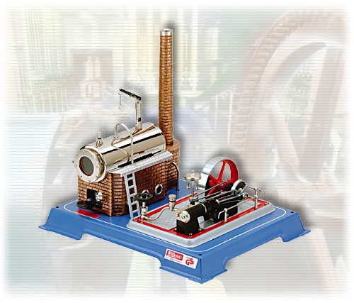 Messingkessel hochglanzpoliert und vernickelt, Durchmesser 55 mm, Länge 140 mm, Kesselinhalt 250 cm³, mit als Schauglas ausgebildetem Wasserstandsanzeiger. Kessel-haus mit Ziegelsteinmuster, zwei Laufstege mit Leiter. Doppelt wirkender, feststehender Messingzylinder, mit einem in beide Drehrichtungen anwerfbaren Schwungrad, Federsicherheitsventil, Dampfpfeife mit Kettenzug, Dampfabsperr-Handradventil, Schwungrad 80 mm Durchmesser mit Antriebsscheibe und massivem, formschönen Druckgussgestänge, Zentrifugalregulator, Dampfstrahlöler und Galeriestange. Der Kamin raucht originalgetreu.