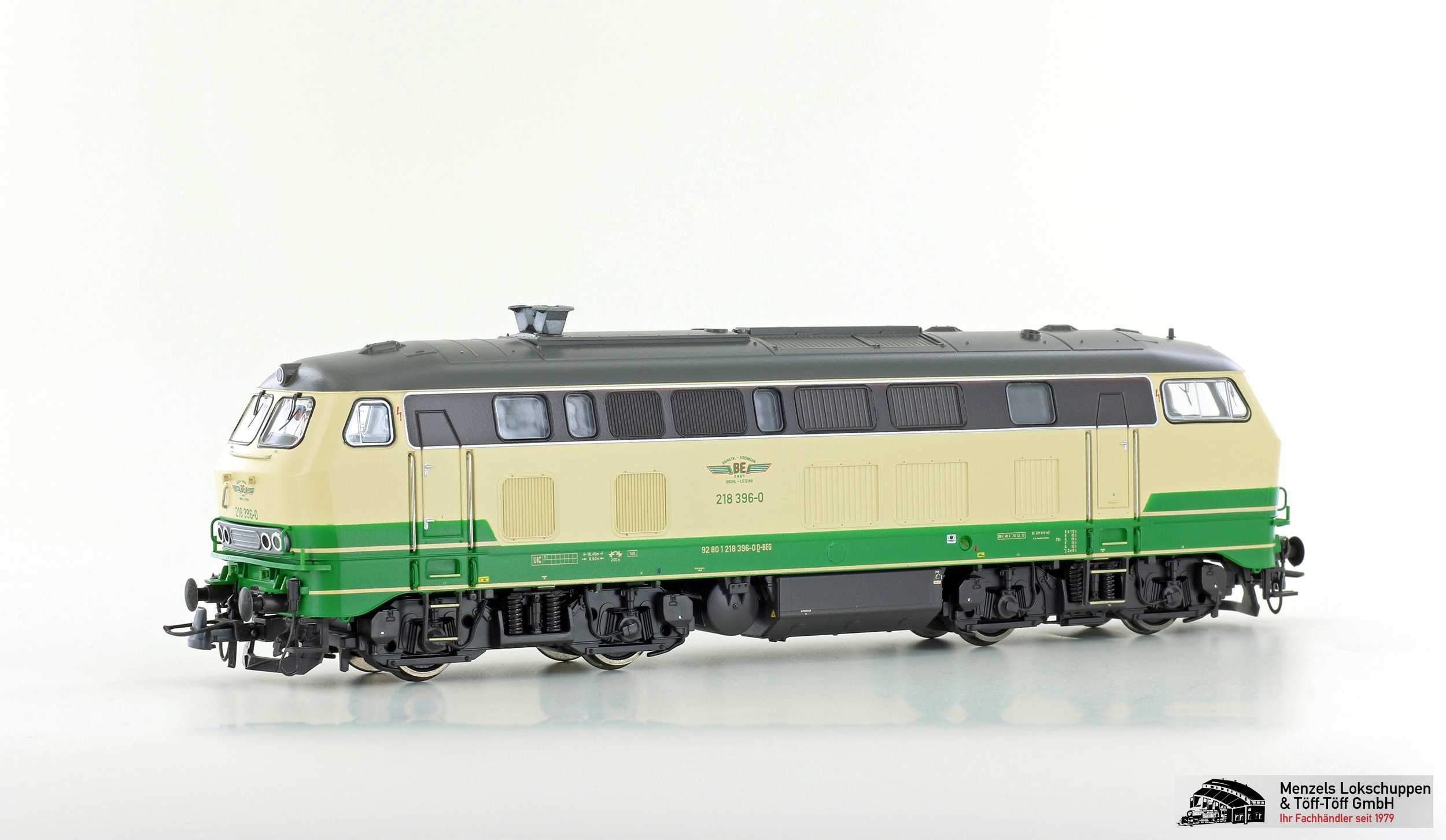 Ab 1971 stellte die Deutsche Bundesbahn 398 Serienloks der BR 218 in Dienst und setzt sie sowohl vor Reise- als auch vor Güterzügen ein. Sie werden auf den meisten nicht elektrifizierten Strecken eingesetzt und erreichen eine Höchstgeschwindigkeit von 140 km/h bei einer Leistung von 1.840 kW. Die Baureihe 218 hat im Laufe der Zeit einige Farbvarianten durchwandert. Die ersten 218er wurden noch in der für Diesellokomotiven üblichen Farbgebung in purpurrot geliefert. Ab 1975 bestimmten die Farben Ozeanblau/Beige das äußere Bild der Lokomotiven. Unsere 218 117 wurde 1971 bei Friedrich Krupp Essen mit der Fabriknummer 5138 gebaut und im September des gleichen Jahres an die damalige Deutsche Bundesbahn ausgeliefert. Das Erst-BW der purpurroten Lokomotive war dann Flensburg. Mittlerweile 52 Jahre alt ist die 218 117 immer noch im Einsatz, von der NeSA Eisenbahn-Betriebsgesellschaft Neckar-Schwarzwald-Alb mbH, Rottweil erhielt die Lok 2021 Ihr aktuelles Farbkleid im ehemaligen "CityBahn" Farbschema, mittlerweile ist Sie für KHR - Kübler Heavy Rail GmbH unterwegs.