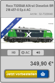 Ab 1971 stellte die Deutsche Bundesbahn 398 Serienloks der BR 218 in Dienst und setzt sie sowohl vor Reise- als auch vor Güterzügen ein. Sie werden auf den meisten nicht elektrifizierten Strecken eingesetzt und erreichen eine Höchstgeschwindigkeit von 140 km/h bei einer Leistung von 1.840 kW. Die Baureihe 218 hat im Laufe der Zeit einige Farbvarianten durchwandert. Die ersten 218er wurden noch in der für Diesellokomotiven üblichen Farbgebung in purpurrot geliefert. Ab 1975 bestimmten die Farben Ozeanblau/Beige das äußere Bild der Lokomotiven. Unsere 218 457 wurde 1978 bei Henschel & Sohn in Kassel gebaut und in den Farben Ozeanblau/Beige an die damalige Deutsche Bundesbahn ausgeliefert. Seit Ende 2019 ist die Lok im Besitz der AIXrail Gmbh Aachen zuerst noch in verkehrsroter Lackierung, erstrahlt Sie nun in einem neuen Farbkleid im auffälligen AIXrail-Design. Nach der damit verbundenen Sanierung des Lokkastens, ist die Lokomotive seit Anfang März 2023 wieder in Betrieb.