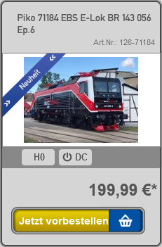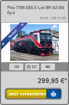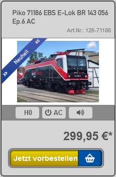 Die Lokomotive mit der Betriebsnummer 143 056-0 wird in einer Gesamtauflage von nur 400 Stück in den Versionen DC, DCC Sound und AC Sound exklusiv nur für uns produziert. Die Auslieferung der Modelle soll laut Hersteller voraussichtlich im 3. Quartal 2022 erfolgen.