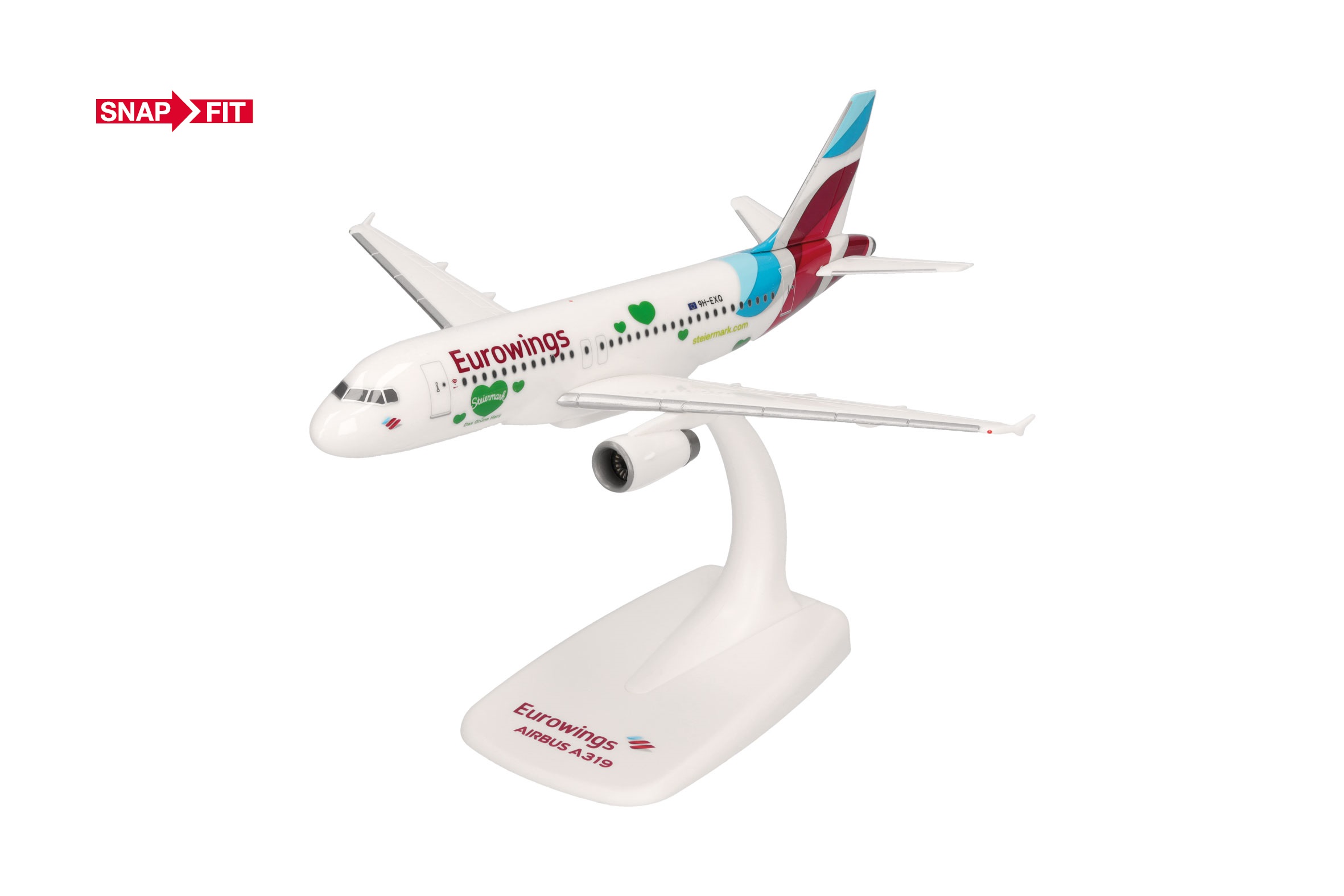 Burgen, Berge und Wein das zieht jedes Jahr rund vier Millionen Touristen in die Steiermark. Seit 2023 unterhält Eurowings eine eigene Basis am Flughafen Graz, von dem aus derzeit elf Destinationen in Europa und Nordafrika angeflogen werden. Um ihr Engagement in der Alpen-Adria-Region mit dem südlichen Österreich, Norditalien und Slowenien zu betonen, ging Eurowings mit dem Tourismusbüro des Landes eine Partnerschaft ein und wirbt mit grünen Herzen für das Bundesland als Reiseziel Die Steiermark wirbt für sich als das grüne Herz Österreichs. Snap-Fit-Modelle von Herpa überzeugen mit einem unschlagbaren Preis-/Leistungsverhältnis. Sie werden mit einem Display-Stand geliefert und sind mit wenigen Handgriffen ohne Kleber oder sonstigen Werkzeugen zusammengebaut.