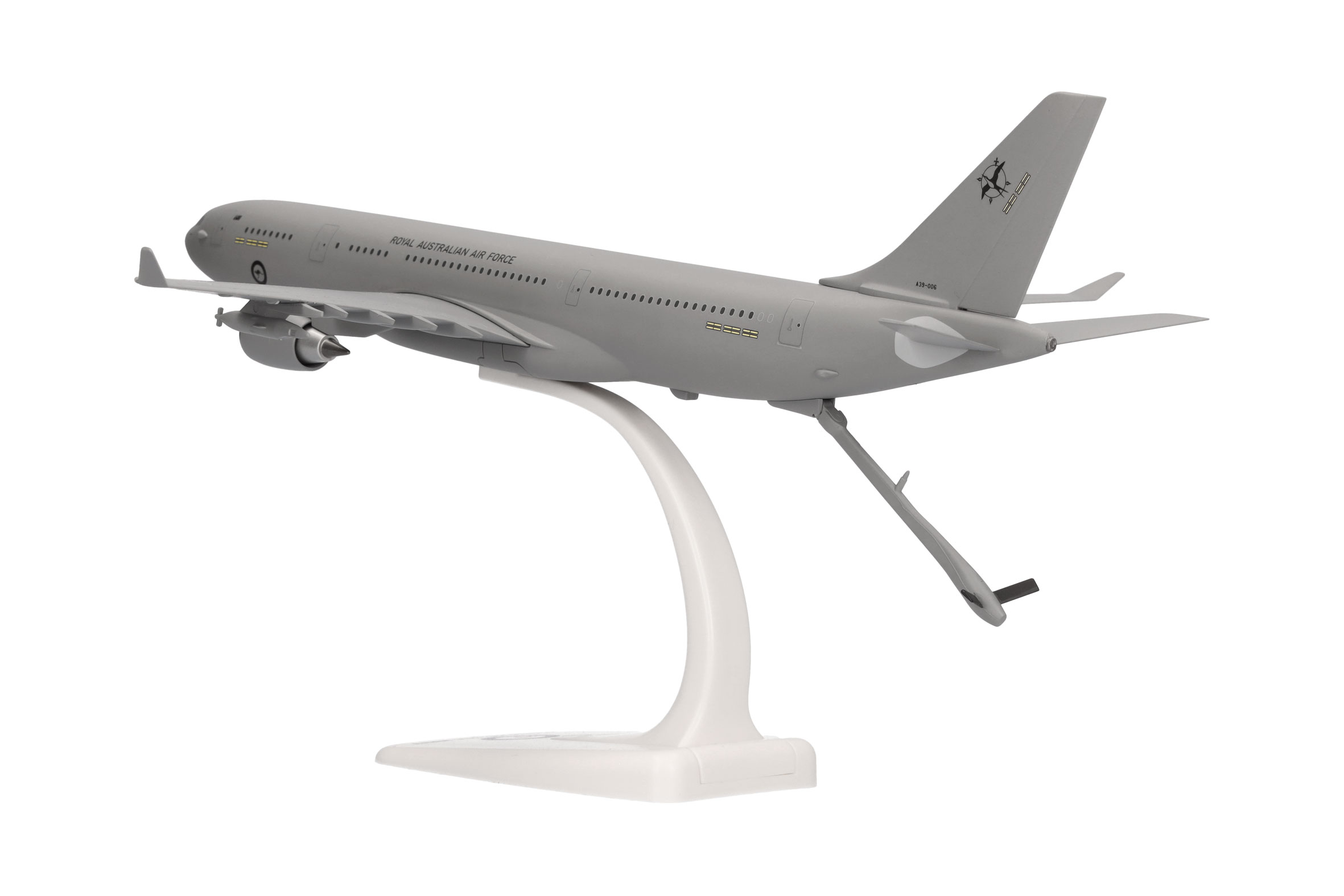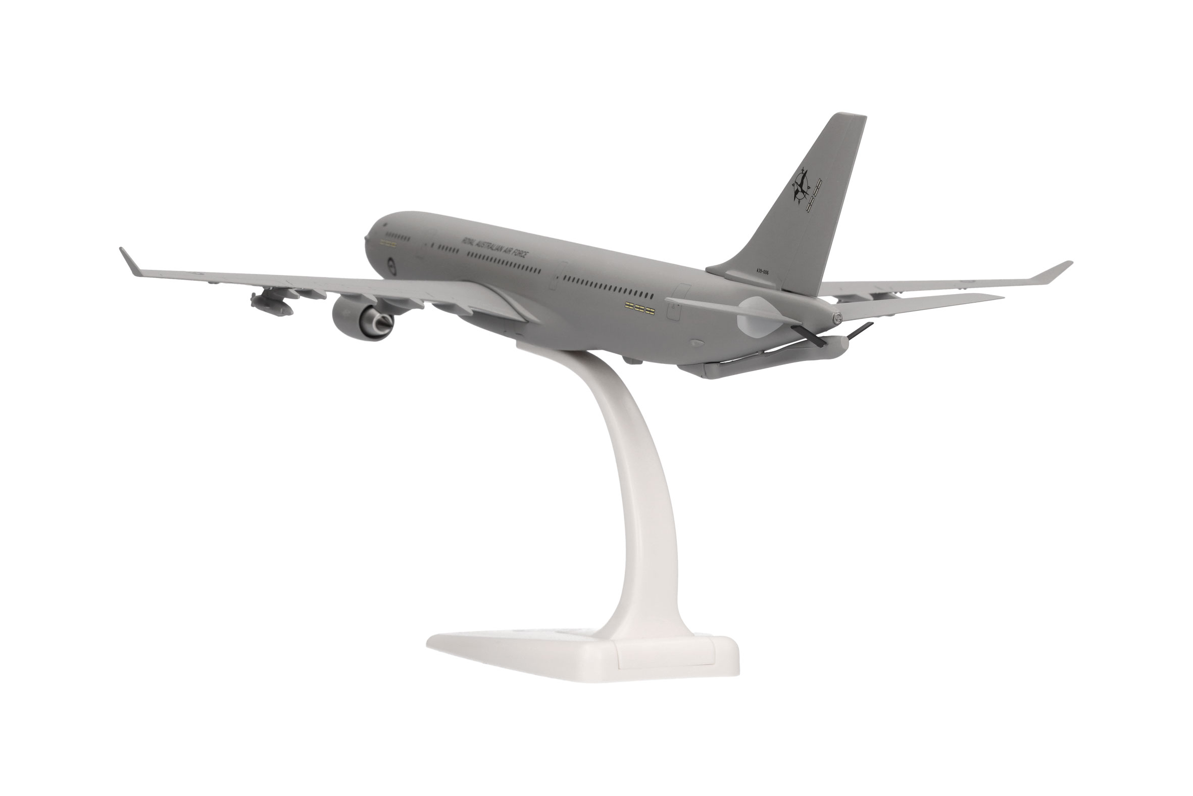 Der mächtige Rumpf des auf der A330-200 basierenden Tankflugzeugs nimmt weit über 100 Tonnen Kraftstoff zur Abgabe an andere Flugzeuge oder stattdessen 45 t Fracht oder 300 Soldaten auf. Unter optimalen Bedingungen kann die A330 MRTT selbst bis zu 14.800 km weit fliegen. Erstkunde wurde Australien und stellte das erste von sieben Exemplaren unter der Bezeichnung KC-30 Voyager Mitte 2011 in Dienst. Bis heute sind es gut zehn Länder, deren Luftwaffen mehr als 80 Maschinen bestellt haben. Neben den Schlauchbehältern auf der Unterseite der Tragflächen, erscheint diese Formneuheit mit dem Tankausleger am Heck, welches bei diesem 1:200er Modell in zwei Positionen dargestellt werden kann.