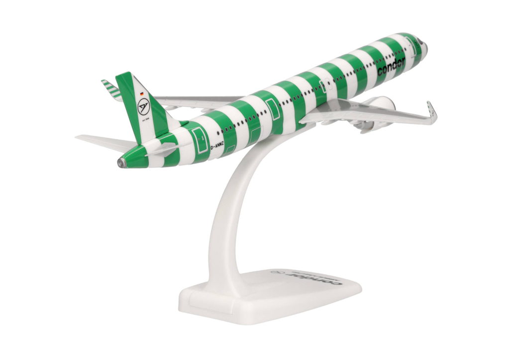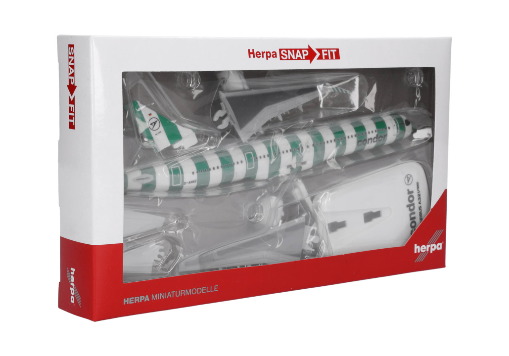 Mit einer Großbestellung von nicht weniger als 28 Airbus A321neo modernisiert der deutsche Ferienflieger seine Kurz- und Mittelstreckenflotte. Die neuen Flugzeuge ersetzen ältere A321 sowie die verbliebenen Boeing 757-300. Das erste Exemplar war mit Streifen in "Island Grün" lackiert und wurde im Juni 2024 an Condor ausgeliefert. SnapFit-Modelle von Herpa überzeugen mit einem unschlagbaren Preis-/Leistungsverhältnis. Sie werden mit einem Display-Stand geliefert und sind mit wenigen Handgriffen ohne Kleber oder sonstige Werkzeuge zusammengebaut.