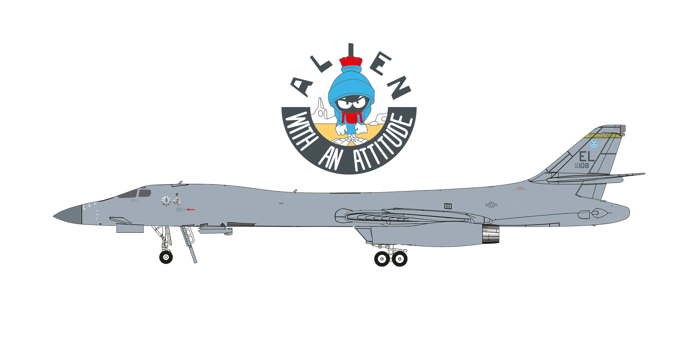 Turnusmäßig werden strategische Bomber von den USA ins Ausland verlegt, um Präsenz zu zeigen und die Zusammenarbeit mit den Luftwaffen verbündeter Länder zu üben. Eine solche Basis befindet auch auf der pazifischen Insel Guam, auf der die US-Luftwaffe mit der Andersen Air Force Base einen strategisch wichtigen Stützpunkt unterhält. 2024 wurden auch vier B-1 Lancer der 37. Staffel aus Ellsworth in South Dakota, darunter auch das Vorbild dieser Neuheit in 1:200, auf dem auch, wie bei Bomber-Crews beliebt, auch ein Nose Art aufgemalt wurde. In diesem Fall erinnert der abgebildete und schlecht gelaunte Außerirdische wohl nicht zufällig an Marvin den Marsmensch aus den beliebten Cartoons um Bugs Bunny. Auch bei dieser neuesten Auflage der B-1 sind die Tragflächen schwenkbar. Zudem liegt die Einstiegsluke mit herausgefahrener Treppe bei.