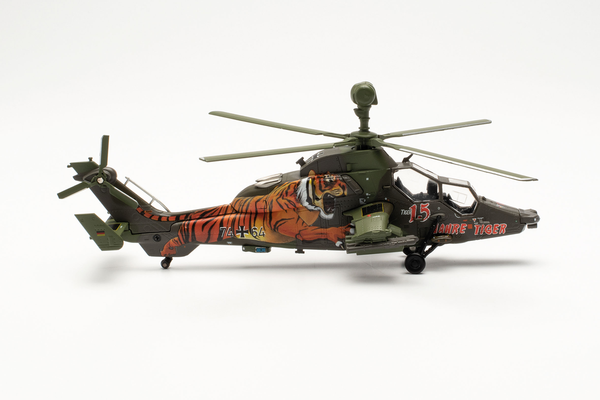 Ursprünglich zur Panzerabwehr gedacht, entwickelte sich der 2003 in Dienst gestellte Hubschrauber zu einer Mehrzweckplattform. So gibt es verschiedene Versionen, die deutschen Heeresflieger nutzen den über 300 km/h schnellen Tiger als bewaffneten Unterstützungshubschrauber. Im Unterschied zu den von etwa Frankreich, Spanien oder Australien eingesetzten Versionen, ist die deutsche Variante UHT mit dem OSIRIS Mastvisier ausgerüstet, das die Aufklärung oder Zielerfassung aus der Deckung heraus ermöglicht. 74+64 zählt zum Bestand des Deutsch-Französischen Heeresfliegerausbildungszentrums. Zum 15-jährigen Jubiläum der Ausbildungsstaffel in Le Luc erhielt die Maschine eine prächtige Sonderbemalung, passenderweise mit einem im Sprung befindlichen Tiger. Dem Modell liegt ein Displaystand aus Metall bei.