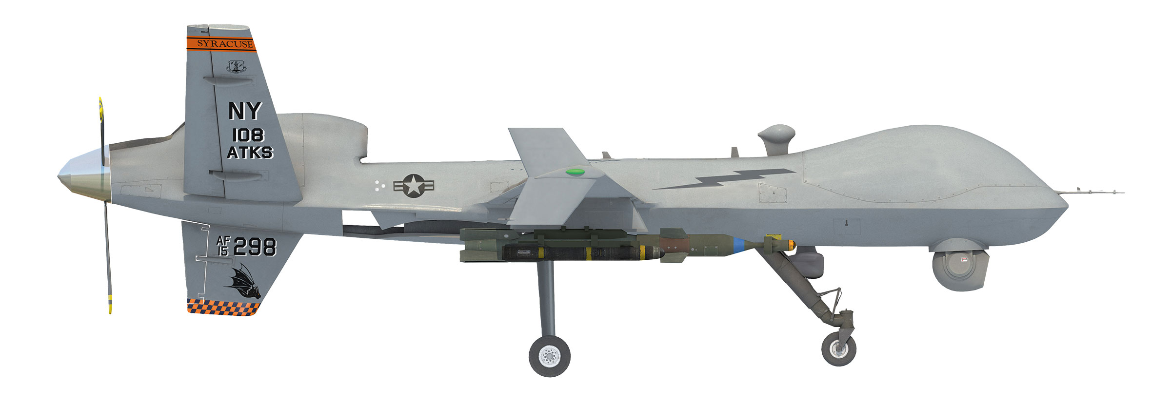 Die MQ-9 Reaper ist ein ferngesteuertes, unbemanntes Luftfahrzeug. Sie wird von einer zweiköpfigen Crew von einer Bodenstation aus geflogen. Im Gegensatz zu früheren Drohnen, die in erster Linie zur Überwachung und Aufklärung eingesetzt wurden, ist die Reaper die erste, die als Angriffsplattform konzipiert wurde. Mit ihrem Turboprop-Triebwerk mit einer Leistung von 900 PS erreicht die MQ-9 eine Höchstgeschwindigkeit von 480 km/h, während die 1.800 kg Treibstoff ihr eine Reichweite von 1.900 km ermöglichen. Unter den 20 Meter langen Flügeln befinden sich bis zu vier Befestigungspunkte für eine Reihe von Waffen, wie z. B. Hellfire-Luft-Boden-Raketen oder lasergesteuerte Bomben. Im Jahr 2007 nahm die US-Luftwaffe den ersten von über 300 bestellten "Sensenmännern" in Empfang. Aufgrund von Verschleiß und der Ausmusterung älterer Flugzeuge sind derzeit rund 220 MQ-9 in mehr als 20 Staffeln aktiv, darunter elf Einheiten der US-Nationalgarde. Die 108. Staffel, die in Syracuse im Bundestaat New York stationiert ist, ist Teil der Nationalgarde des Staates und für die Ausbildung von MQ-9-Besatzungen der US-Luftwaffe sowie der Nationalgarde zuständig. Dieses Metallmodell im Maßstab 1:72 kann wahlweise mit ausgefahrenem oder eingezogenem Fahrwerk ausgestellt werden. Zwei Sätze von Fahrwerkselementen sowie ein Displaystand sind im Lieferumfang enthalten.