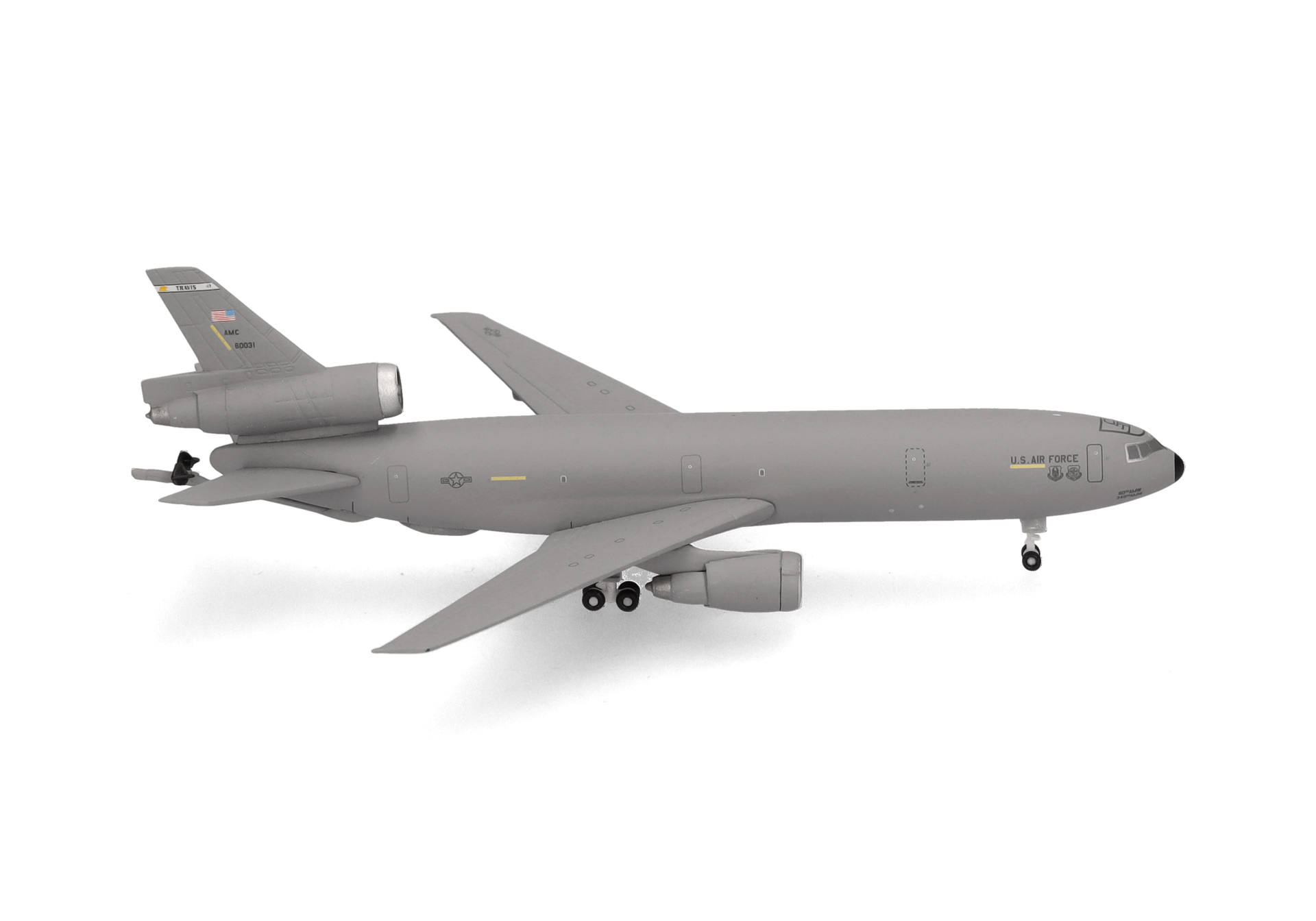 Am 26. September 2024 verließen die letzten beiden KC-10 Extender, darunter das Exemplar mit der Seriennummer 86-0031, den Luftwaffenstützpunkt Travis im US-Bundesstaat Kalifornien und machten sich auf den Weg zur 309. Aerospace Maintenance and Regeneration Group im benachbarten Bundesstaat Arizona, die für das Einmotten, die Verwertung und Verschrottung von Flugzeugen zuständig ist. Seit 1980 war die KC-10 ein wichtiger Bestandteil der amerikanischen und alliierten Streitkräfte und flog Lufttransport- und Luftbetankungsmissionen rund um den Globus. Oft auch aufgrund ihrer im Vergleich zu anderen Militärjets bequemen und großzügigen Ausstattung als Gucci-10 bezeichnet, konnte die KC-10 doppelt so viel Treibstoff mitführen wie die die ältere KC-135 und gleichzeitig fast genau so viel Fracht befördern wie die C-17 Globemaster. Zum Gedenken an die Ausmusterung bringt Herpa im Frühjahr und Sommer 2025 eine kleine, auf drei Modelle limitierte Serie des Dreistrahlers heraus. Das erste Modell trägt die Abzeichen der 60th Air Mobility Wing, der letzten Einheit der US-Luftwaffe, die den Extender eingesetzt hat.
