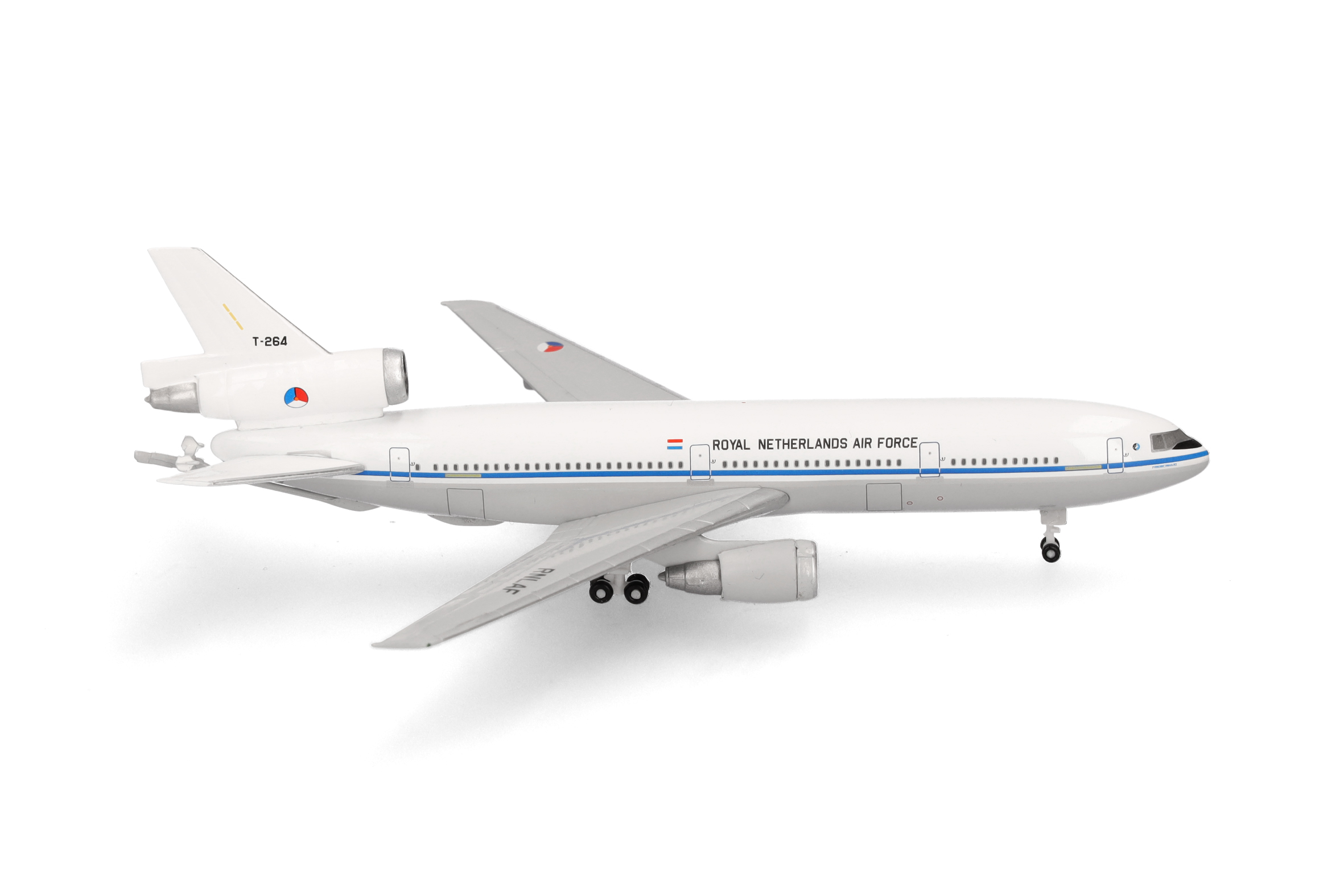 Am 26. September 2024 verließen die letzten beiden KC-10 Extender den Luftwaffenstützpunkt Travis im US-Bundesstaat Kalifornien. Seit 1980 war die KC-10 ein wichtiger Bestandteil der amerikanischen und alliierten Streitkräfte und flog Lufttransport- und Luftbetankungsmissionen rund um den Globus. Die KC-10 konnte doppelt so viel Treibstoff mitführen wie die ältere KC-135 und gleichzeitig fast genau so viel Fracht befördern wie die C-17 Globemaster. Zum Gedenken an die Ausmusterung bringt Herpa eine kleine, auf drei Modelle limitierte Serie des Dreistrahlers heraus. Das erste Modell trägt die Abzeichen der 60th Air Mobility Wing, der letzten Einheit der US-Luftwaffe, die den Extender eingesetzt hat (Art.Nr. 538367). Einziger ausländischer Betreiber der KC-10 war die niederländische Luftwaffe, die ab 1995 vor 30 Jahren zwei Exemplare als Teil der 334. Staffel in der Luftbetankung auch für NATO-Partner in Dienst stellte, die häufig auch für friedenserhaltende und humanitäre Missionen weltweit im Einsatz standen.Als Teil der limitierten Serie zur Außerdienststellung des dreistrahligen Tankers erscheint dieses Modell in der zivil anmutenden Farbgebung, die sie 1995 bei der Auslieferung an die niederländischen Streitkräfte trug.
