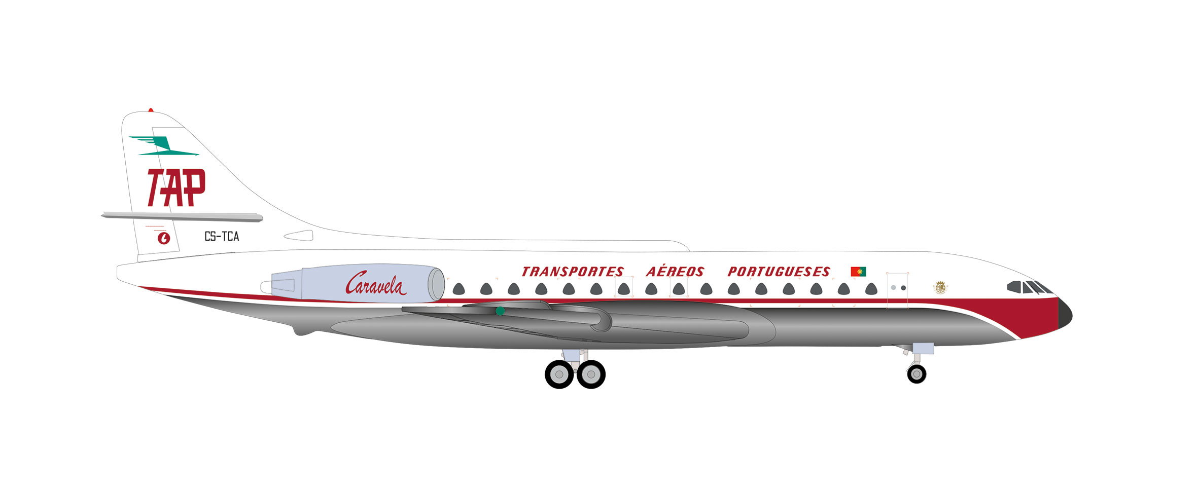 1955 ? vor 70 Jahren ? hob die Caravelle des französischen Herstellers Sud Aviation zu ihrem Jungfernflug ab. Sie war eines der ersten strahlgetriebenen Verkehrsflugzeuge für kurze und mittlere Strecken. Neu war seinerzeit die Anordnung der Triebwerke am Heck ? ein Konzept, das später oft kopiert werden sollte. Parallel zu diesem Jubiläum bietet Herpa im Maßstab 1:500 eine kleine Serie in einmalig limitierten Auflagen an. Den Anfang machte eine Caravelle in den Farben von Finnair (Art.Nr. 538510). Als zweites Modell der kleine Jubiläums-Serie folgt ein Zweistrahler aus Portugal. 1962 begann bei TAP mit der Auslieferung der CS-TCA als erste von insgesamt sechs Caravelle das Jet-Zeitalter. Mit der Indienststellung konnte TAP ihr Netzwerk innerhalb Europas, unter anderem nach Deutschland und in die Schweiz, erheblich ausbauen. Die Caravelle bot einen erheblichen Gewinn an Zeit und Komfort gegenüber den bis dahin eingesetzten Douglas DC-3 und DC-4, die teils noch aus Altbeständen der US-Luftwaffe stammten. Die letzten Caravelle-Jets wurden erst 1975, vor 50 Jahren, außer Dienst gestellt.