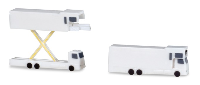 Mit diesem dreiachsigen Catering-LKW erreichen Sie nun auch in 1:500 die obere Etage des A380. Wie sein großes Pendant in 1:200, sind der Aufbau in der Höhe und die Bela- dungsrampe in der Länge verstellbar.