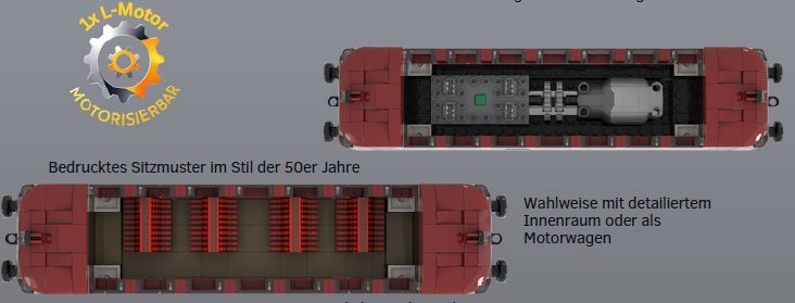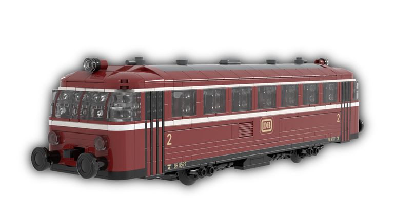 Zeitlose Optik in Klemmbausteinen. Der VT 98 Schienenbus erweckt bei Vielen Erinnerungen an die alte Zeit. Durch sein ikonisches Design ist er unverwechselbar und elegant zugleich - nicht nur von außen, sondern auch von innen. Das Klemmbausteinmodell überzeugt durch eine nahtlose Optik (unter der Zuhilfenahme von Prints) an Front und Türen, sowie über viele bedruckte Details an den Frontscheiben und den Seiten. Ebenfalls bedruckt sind die Sitzbänke im Inneren, sodass beim Aufbau der Flair der 50er Jahre vermittelt wird. Das Modell lässt sich in 2 Varianten Aufbauen, einmal mit Inneneinrichtung und einmal mit Motorisierung mittels L Motor. Durch die verbaute Kupplungsmöglichkeit an den Wagenenden, lassen sich auch leicht Doppeltraktionen bilden.