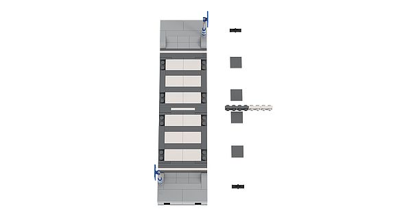 Auch Fußgänger müssen die Straße gefahrenlos überqueren können, hierzu gibt es den Zebrastreifen integriert auf ein 8 Noppen (6,4 cm) langes Modul. Das Modul verfügt auf allen Seiten über Anbindungsmöglichkeiten per Pin-Steckverbindern und zusätzlich über die Anbindungsmöglichkeit zu anderen Straßenmodulen über Fliesen die dem Set ebenfalls beilegen.