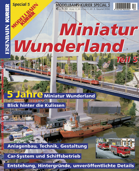 Modellbahn-Kurier Special 6. Miniatur Wunderland (5), Blick hinter die Kulissen. 5 Jahre Miniatur Wunderland - zu diesem Jubiläum erscheint der fünfte Modellbahn-Kurier Special über die weltgrößte Modelleisenbahnanlage in Hamburgs historischer Speicherstadt. Erstmals wird kein neuer Bauabschnitt präsentiert, vielmehr werfen wir einen Blick hinter die Kulissen, berichten über Technik, Baumethoden und Gestaltung. Die Entstehungsgeschichte wird aus verschiedenen Sichtweisen geschildert. In weiteren Kapiteln werden bislang unveröffentlichte, zum Teil von den Besuchern nicht einsehbare Details gezeigt. Auch die Veränderungen der letzten Jahre in den bestehenden Bauabschnitten werden dokumentiert. Weitere Themen sind das Car-System und die Schiffssteuerung. Ein besonderes Modellbahn-Kurier Special, informativ für jeden Modellbahner und eine wahre Fundgrube für den Wunderland-Fan.
