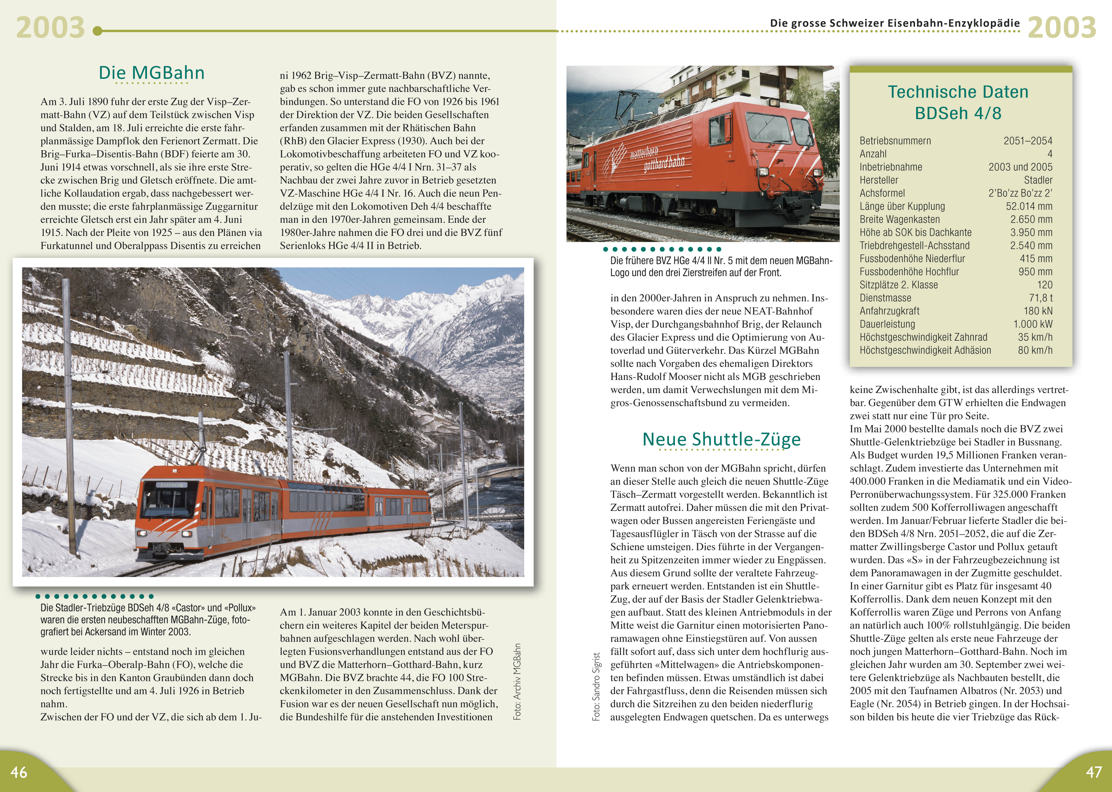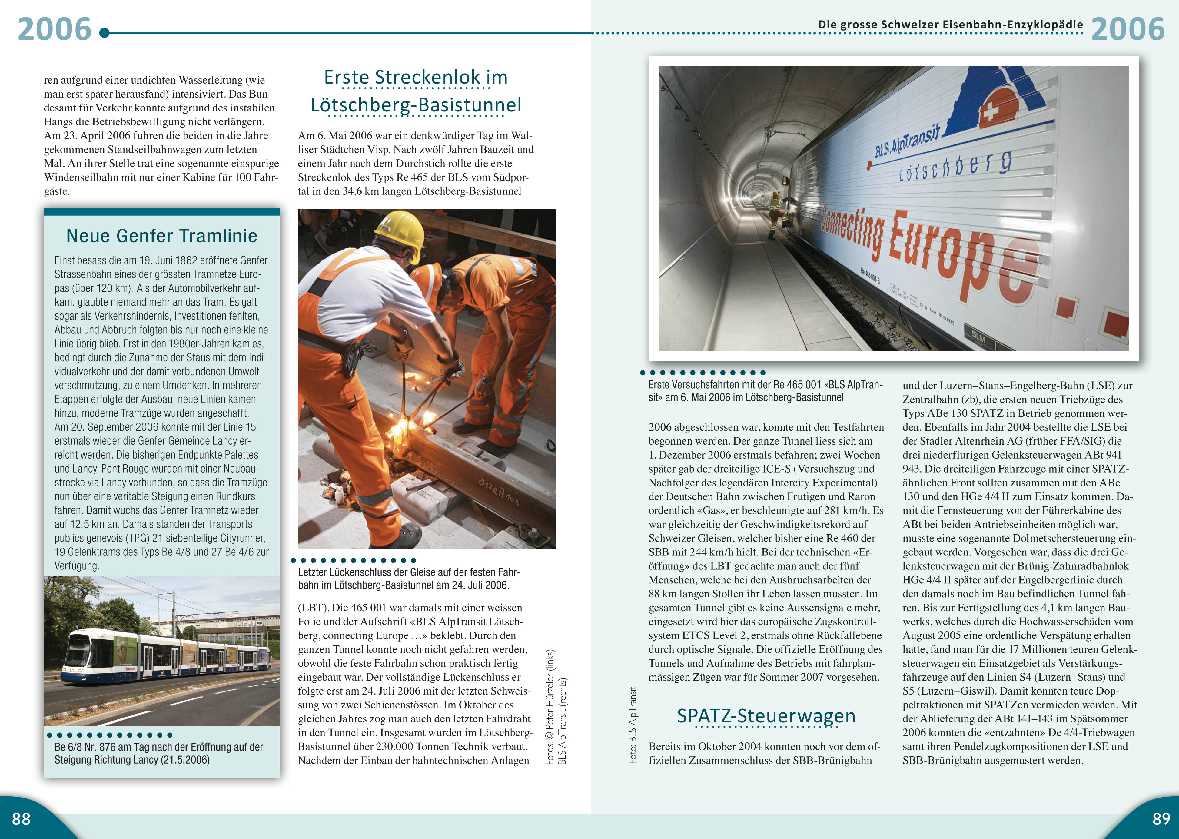 In der Schweiz konnten 2004 die Neubaustrecke Mattstetten?Rothrist und 2007 der Lötschberg-Basistunnel eröffnet werden. In Zürich fuhr mit dem «Cobra» ein neues Niederflurtram. Am 1. Januar 2004 trat das neue Behindertengleichstellungsgesetz in Kraft und sorgte für einen Investi­tionsschub bei den Schweizer Bahnen. Für die neue S-Bahn Zug lieferte Stadler den ersten FLIRT. Am 22. Juni 2005 ging nach dem Blackout auf dem SBB-Netz gar nichts mehr. Der Glacier Express erhielt 2006 neue Wagen und die Rhätische Bahn 2009 mit dem «Allegra» den stärksten Meterspur-Triebzug der Schweiz.