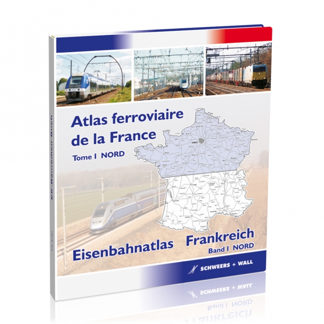 Eisenbahnatlas Frankreich, Band 1: Nord. 112 Seiten mit 77 Kartenseiten 1:300.000 und zusätzlichen Detailkarten 1:75.000, 235 x 275 mm. Die Edition erfolgreicher Atlanten aus dem Hause Schweers+Wall wird mit dem Frankreich-Atlas fortgesetzt. Dieser wird in zwei Teilen erscheinen. Der erste Band stellt die Eisenbahnstrecken im Norden Frankreichs dar. Auf 77 Kartenseiten im Maßstab 1:300.000 sind alle Strecken nach dem bekannten Muster bisheriger Schweers+Wall-Atlanten dargestellt, die elektrifizierten Strecken sind entsprechend der verwendeten Spannungen (25 kV oder 1,5 kV) farblich unterschiedlich angelegt. Detailkarten im Maßstab 1:75.000 der Orte Brest, Lille, Paris und Straßburg sowie ein umfangreiches Ortsverzeichnis runden das neue Standardwerk ab.
