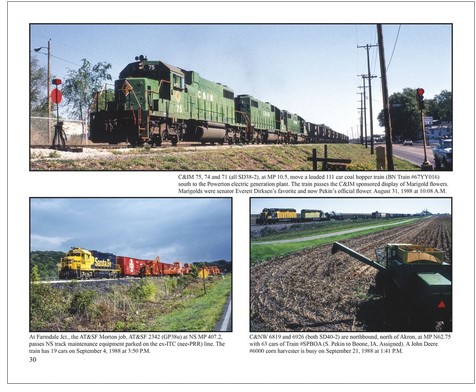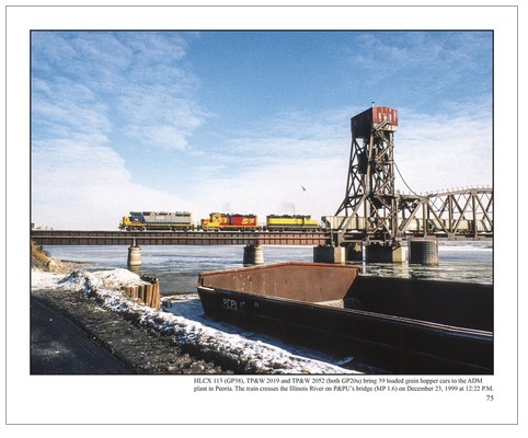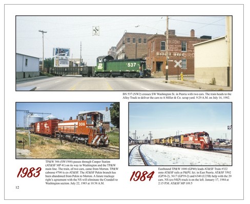 Peoria, Illinois was a railroad hub between Chicago and St. Louis. The Santa Fe, Burlington Northern, Chicago & Illinois Midland, Conrail, Illinois Central, Illinois Terminal, Norfolk & Western, Peoria & Pekin Union, Toledo Peoria and Western, and more all feature!