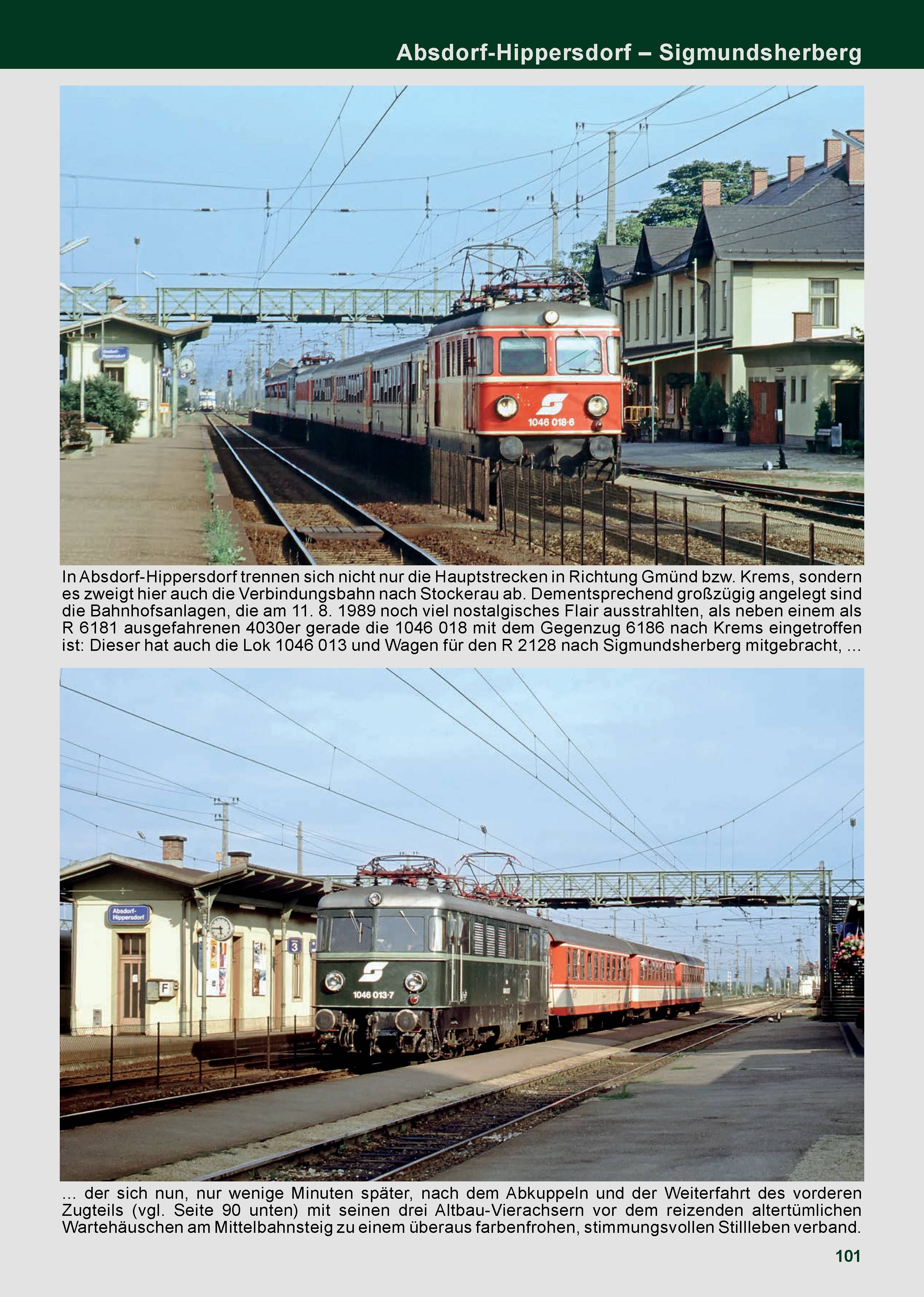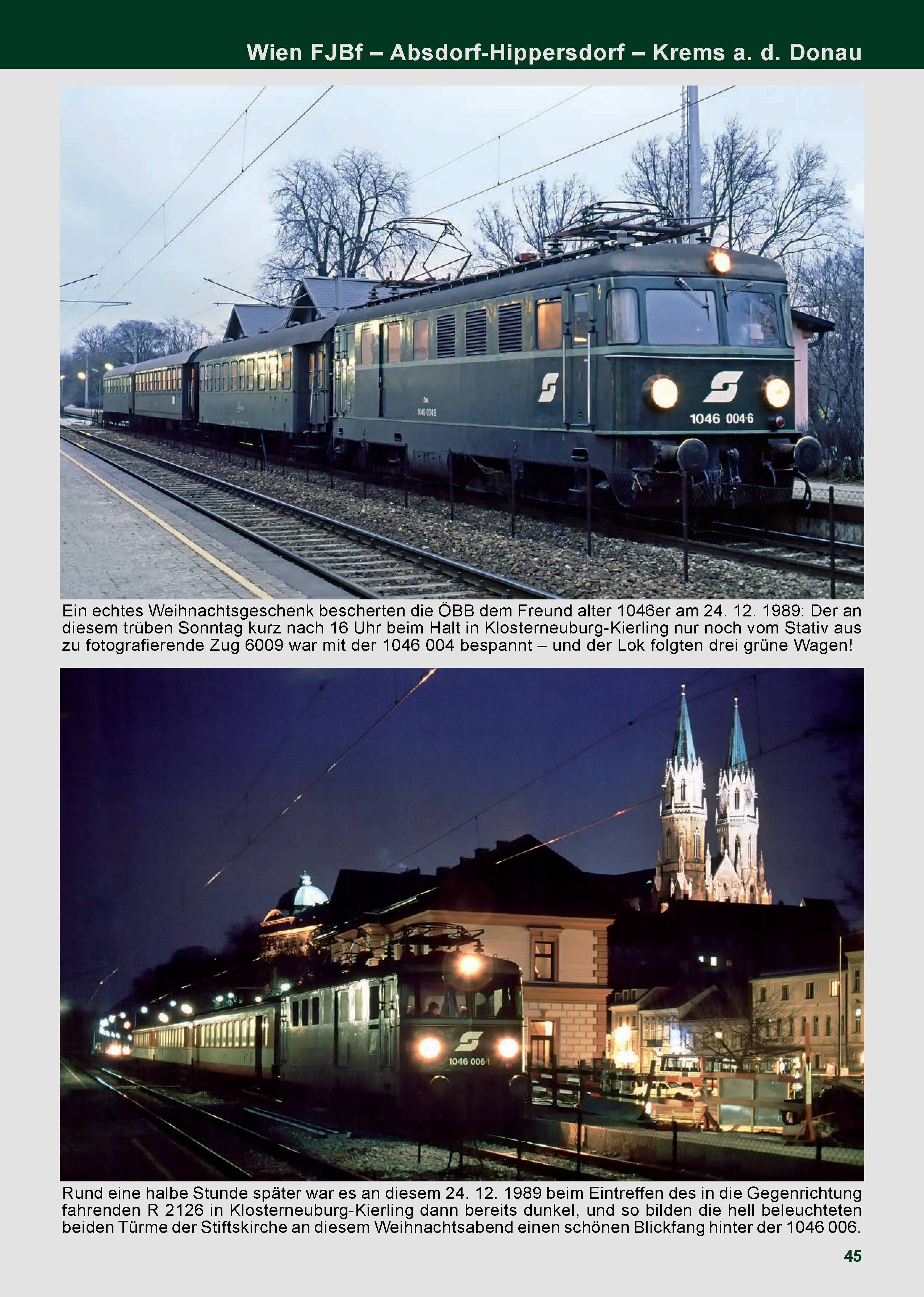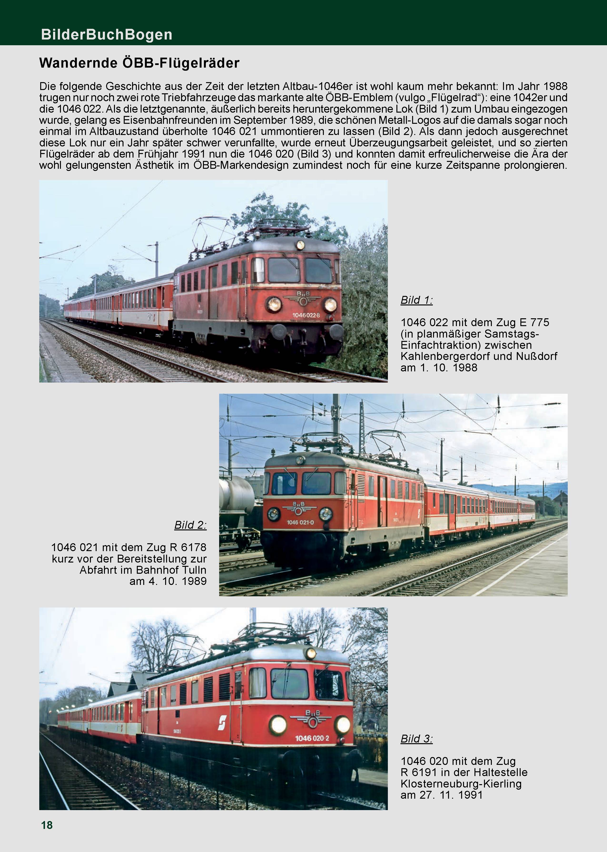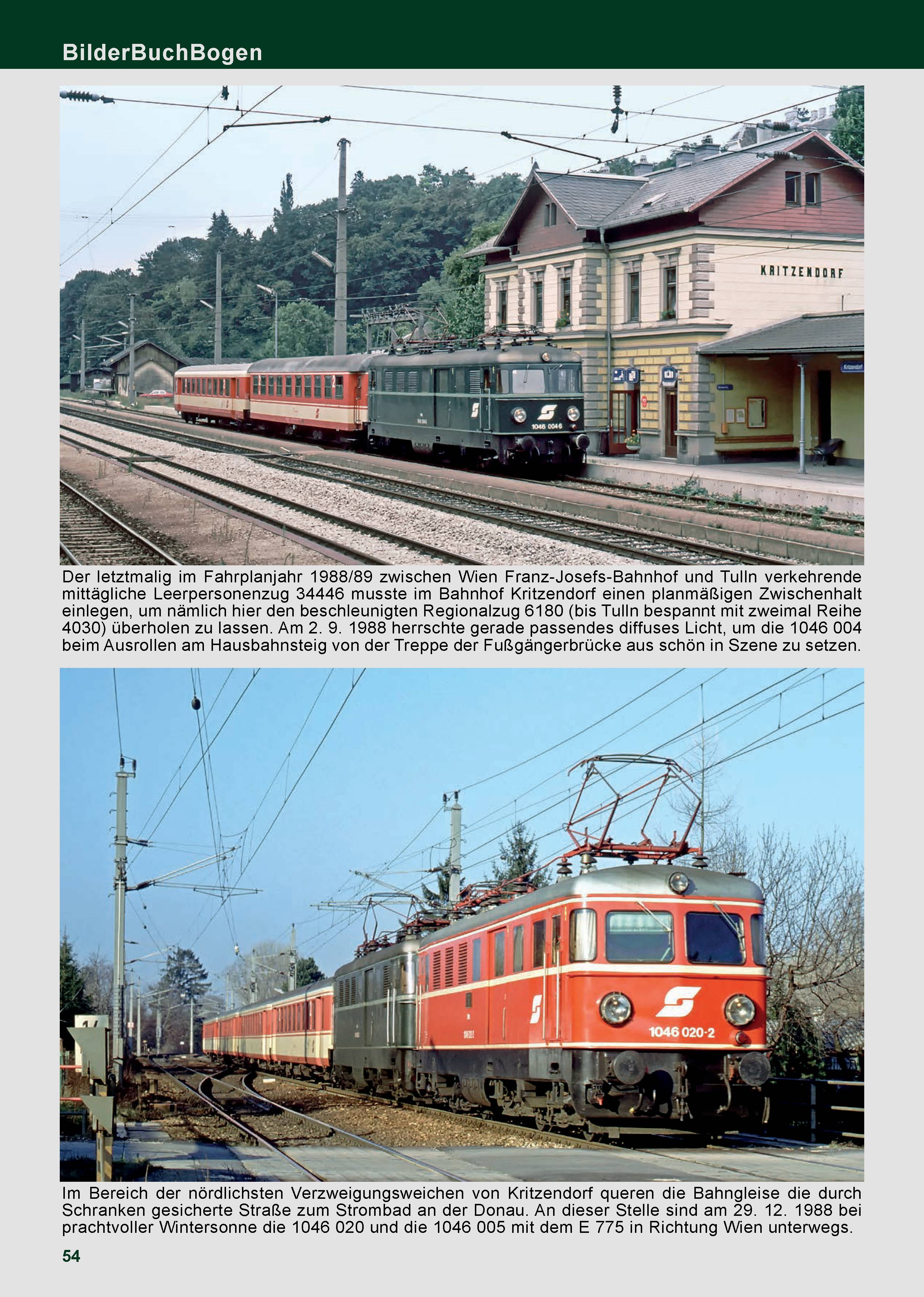 Nach der Triebfahrzeugvielfalt in seinem letzten Buch Grenz-Blicke hat Otto Leiß nun den Anstoß zu einem BilderBuchBogen ausschließlich über jene Elektrolok-Baureihe gegeben, deren Design unverkennbar das Vorbild für die 1042er gewesen ist: Von den genau vor 60 Jahren als Gepäcktriebwagen 4061 konzipierten Fahrzeugen der Reihe 1046 waren von 1988 bis 1993 viele noch im schlichten und eleganten Originalaussehen auf der landschaftlich reizvollen Franz-Josefs-Bahn im Einsatz, wovon der Hauptteil dieses Buches mit fast 200 Fotos ein umfassendes Zeugnis ablegt: Zahlreiche Besonderheiten, wie etwa interessante Doppeltraktionen, rein-grüne Personenzüge oder Flügelräder tragende 1046er komplettieren zusammen mit den zugehörigen Umlaufplänen und Kursbuchauszügen diese Dokumentation. Ko-Autor Werner Prokop bietet sodann mit Archivmaterial aus der Sammlung Grafenberg einen spannenden Einblick in die Entstehungsgeschichte der Reihe 1146 sowie den Umbau von 1046ern in die "Valousek-Version HG-1046" samt ungewohnt anmutenden Anstrichvarianten. Mit den derart gelifteten 1046ern befahren wir abschließend die Ostregion rund um Wien und beenden diesen sehr umfangreichen BilderBuchBogen mit einem Blick auf die heute noch erhaltenen Maschinen dieser interessanten Baureihe.