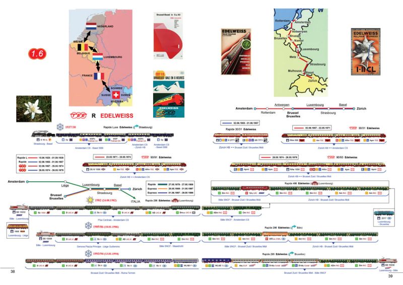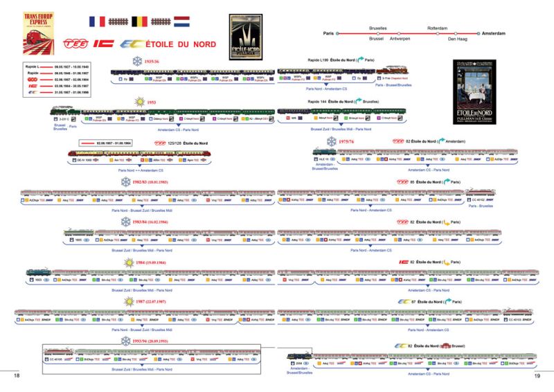 Dieses Buch vereint nicht nur die Kompositionen der 66 Trans Europ Express-Züge, die von 1957 bis 1995 liefen, sondern auch für die gleichnamigen Züge, ob vor 1957 oder nach 1995. Neben Express oder Stromschnellen gibt es den deutschen Fernschnellzangege, die Intercity, dann die EuroCity und schließlich die TGVs und die ICEs. So haben modellierer und andere Eisenbahnbegeisterte mehr als 500 verschiedene Kompositionen dieser prestigeträchtigen Züge zur Verfügung, die sich von der Zeit II (1929 bis zur ältesten) Periode V (2004 für die letzte), d.h. einem Überflug von drei Vierteln eines Jahrhunderts Eisenbahngeschichte, erstrecken.