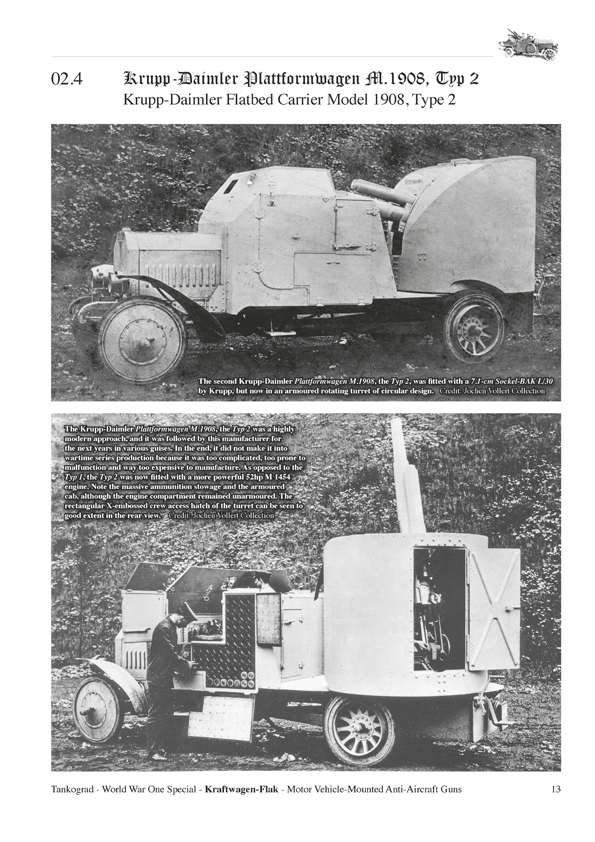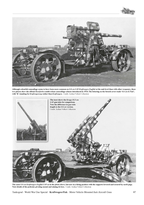 This publication deals in depth with, for the first time ever, the Kraftwagen-Flak motor vehicle-based anti-balloon and anti-aircraft artillery of the Kaiserreich. Lavishly illustrated with contemporary photographs, this book tells the story from pre-war prototypes through to active service during the war years, and even into the post-war Freikorps and Reichswehr periods. Additional chapters cover Kraftwagen-Zugflak motor vehicle-towed trailer-mounted and Raupenflak tracked carrier-mounted anti-aircraft artillery.
