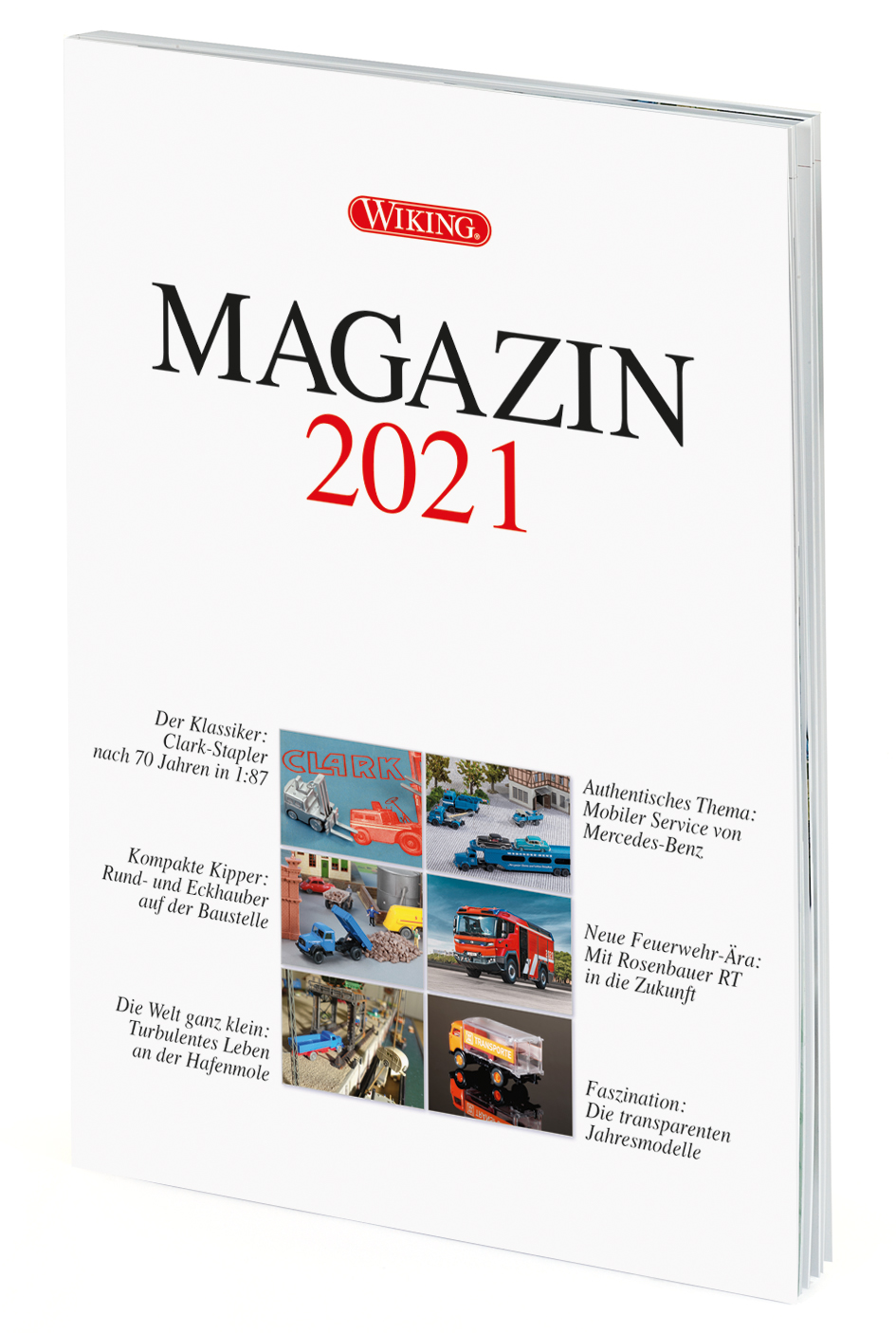 Exklusive Hintergründe zu WIKING und seinen Modellen Druckfrisch liegt die Markenlektüre des Jahres auf dem Tisch ? das WIKING-MAGAZIN 2021 erzählt Geschichten über Hintergründe, die keine andere Modellmarke zu berichten weiß. Das beweist die Themenzusammenstellung, die Reportagen über Miniaturen und Hintergründe ebenso zusammengetragen hat wie die Modellchronologie über die Wohnwagen und Wohnmobile. Diesmal steht der Clark Stapler ebenso wie der Normag Faktor I im Mittelpunkt, wie sie vom großen Industriemodell des ersten Nachkriegsjahrzehnts mehr als 60 Jahre später den Weg in den Maßstab 1:87 gefunden haben. Außerdem berichtet das Magazin darüber, wie WIKING dem Mercedes-Benz-Service ein modellbauerisches Gesicht gibt und wie der Henschel HS 140 zum Hauber-Gigant in 1:87 wird. Anlässlich von 100 Jahre Sieper-Gruppe wird ausführlich daran erinnert, als WIKING im Jahr 1984 in Folge Nachlassregelung von Gründer Friedrich Peltzer in das Lüdenscheider Familienunternehmen integriert wurde. Selbstverständlich gibt es wieder einen Rückblick auf die Neuheiten vor 25 und 50 Jahren, aber auch ein Diorama wird gezeigt. Es erzählt die lebendige Geschichte vom Leben an der Hafenmole in den 1960er-Jahren. Zugleich schlägt das WIKING MAGAZIN 2021 die Brücke zur Gegenwart und lässt die letztjährigen Neuheiten und die Modellpflege Revue passieren.