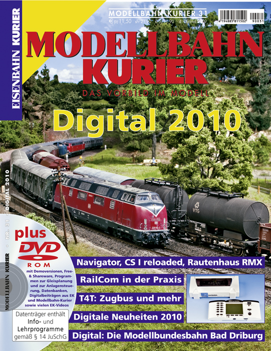 Modellbahn-Kurier 31. Digital 2010 - inkl. DVD. Das Angebot an Digitalkomponenten steigt stetig und eröffnet dem Modellbahner immer mehr Möglichkeiten, auf seiner Anlage realistische Betriebsabläufe zu steuern. Der Modellbahn-Kurier 31 Digital 2010 gibt einen Überblick über den aktuellen Stand der Technik. Die neusten Digitalzentralen werden ebenso vorgestellt, wie viele weitere Digitalkomponenten für den Ausbau der Anlagensteuerung. Weitere Themen sind die Entwicklung bei RailCom, die Anlagensteuerung mit dem PC sowie Erfahrungsberichte von Modellbahnern, die ihre Anlagen digital betreiben. Die beiliegende DVD-ROM bietet zahlreiche Artikel aus dem Eisenbahn-Kurier zum Thema Digital, wie die kompletten Inhalte der Modellbahn-Kuriere 24 Digital und 28 Digital 2008, Links zu allen Herstellern sowie verschiedene Software rund um die digitale Modellbahnsteuerung, zur Gleisplanung etc.