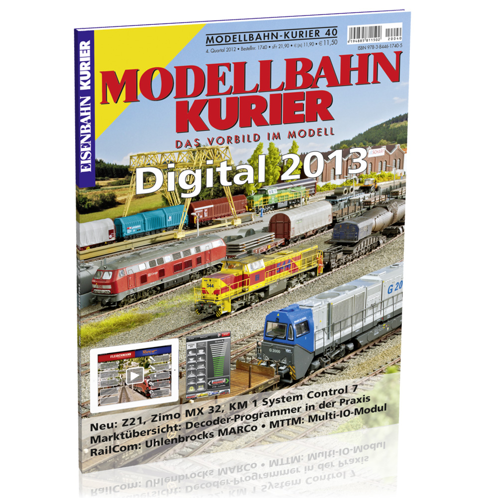 Modellbahn-Kurier 40. Digital 2013. Im Modelljahr 2012 gab es wieder viele digitale Neuheiten, die dem Digitalbahner neue betriebliche Möglichkeiten eröffnen, darunter drei neue Zentralen, die im Modellbahn-Kurier 40 ausführlich vorgestellt werden. Weitere Schwerpunkte sind die Rückmeldung, Decoder-Programme – Hard- und Softwarelösungen – sowie die Vorstellung der MpC-Anlagensteuerung und das Porträt einer großen Anlage, die damit betrieben wird. RailCom bewährt sich zunehmend im Praxiseinsatz – auch dies ist ein Digitalthema 2012.