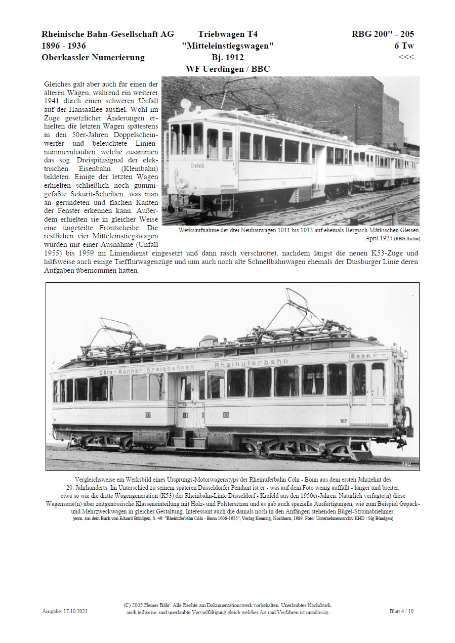 Nicht mehr viele Menschen kennen noch die Altbauwagen der zweiten Rheinbahn-Generation, deren letzte bis Mitte der 1960er-Jahre vereinzelt auf der K-Bahn eingesetzt wurden. Noch viel weniger Leute erinnern sich an die letzten zwei- und vierachsigen Ursprungswagen, die nach den Wiederaufbaujahren bis spätestens Anfang der 1960er-Jahre endgültig aus dem Verkehr gezogen wurden, und von denen nur noch sehr wenige ein paar Jahre als Arbeitswagen in den Betriebshöfen abgestellt waren. Nur eine in den 1920er-Jahren aus einem Salzwagen umgebaute Hilfs-Lok existiert heute noch im Hannoverschen Straßenbahn Museum.
