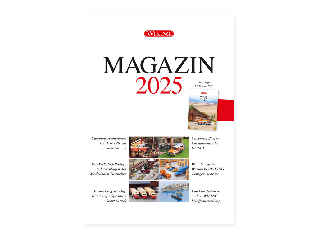 WIKING Geschichten das Magazin macht`s möglich Es hat sich bewährt eine attraktive Markenlektüre mit integriertem Jahreskatalog. So erscheint das WIKING MAGAZIN 2025 mit einer Themenauswahl, die ganz nah an den aktuellen Modellneuheiten berichtet, zugleich aber auch die Modellchronolgie und Markenhistorie in den Fokus nimmt. Mit der Januar-Auslieferung an den Fachhandel präsentiert sich das neue WIKING-Magazin in Kombination mit dem heftmittig integrierten WIKING-Katalog als geschlossenes Sammelwerk in gedruckter Form und stellt damit ein umfangreiches Kompendium der jährlichen Markenaktivitäten in der großen Welt der kleinen Modelle dar. Im Mittelpunkt stehen die angekündigten Neuheiten wie der T2b, der in zahlreichen Ausführungen erhältlich sein wird und damit zur Freude der Sammler eine Lücke in der Bulli-Chronologie schließt. Das WIKING MAGAZIN 2025 beschäftigt sich zusätzlich mit dem neuen Chevrolet Blazer aus den Siebzigerjahren und beleuchtet die bemerkenswerte Englebert-Story. Immerhin war der Reifenhersteller gleich in den Nachkriegsjahren einer der ersten WIKING-Kunden der heute sehr begehrten Werbemodelle. Im Mittelpunkt steht eine Reportage über das Museum für Märklin-Schauanlagen, das im Sommer 2024 geöffnet wurde. Schauanlagen gab es in vielen Spielzeuggeschäften und dort durften die WIKING-Autos nicht fehlen. Einen Rückblick auf die Neuheiten der Jahre 1974 und 1975 sowie auf die beiden Jahrgänge zur Jahrtausendwende 1999 und 2000 zeigt, wie typenreich sich WIKING vor 50 und vor 25 aufgestellt hat. Nicht fehlen dürfen die Hintergründe zur Hamburger Spedition und zum Neueinstieg von WIKING bei Instagram und Facebook. Für die immer größer werdende Zahl von digitaler Verkaufsliteratur ist ebenfalls gesorgt: Auch diesmal ist der Jahreskatalog als eigenständiger Auszug zusätzlich und damit wie gewohnt als E-Paper online downloadbar sein. Jahrespublikation auf 64 Seiten inklusive Katalogseiten.