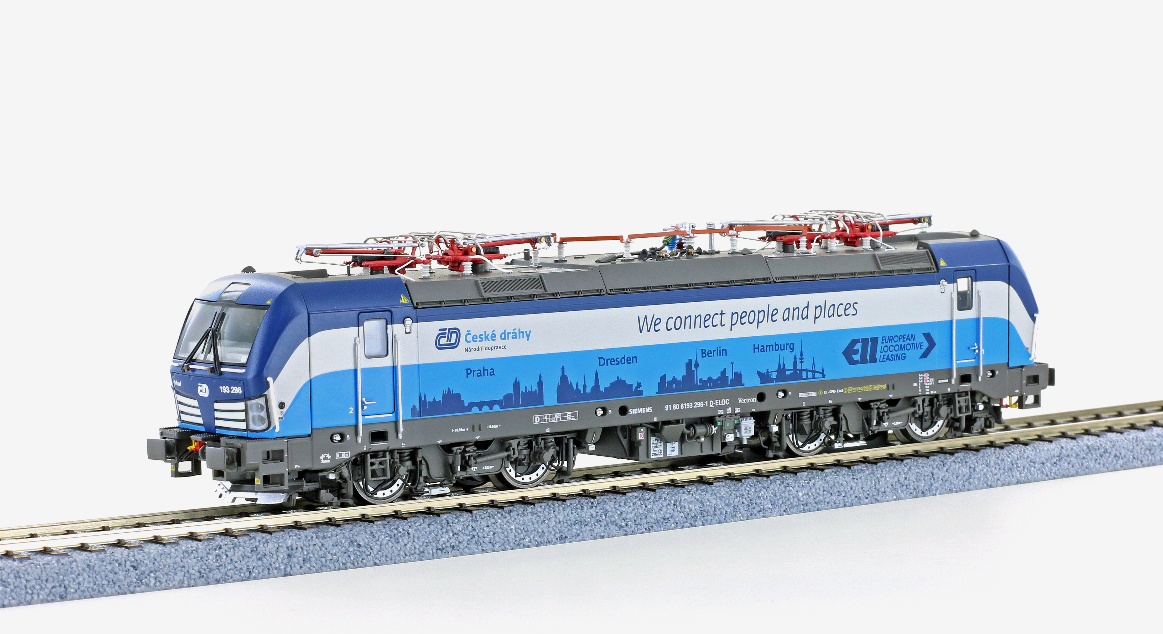 E-Lok BR 193 Vectron MS der CD/ELL, himmelblau/lichtgrau/saphirblau mit der Aufschrift "We connect people and places" 4 Dachstromabnehmer, ausgerüstet für D/A/SK/CZ/H Betriebsnummer 91 80 6193 296-1 D-ELOC mit dem Loknamen "Maxl", für die Epoche 6. (2019)