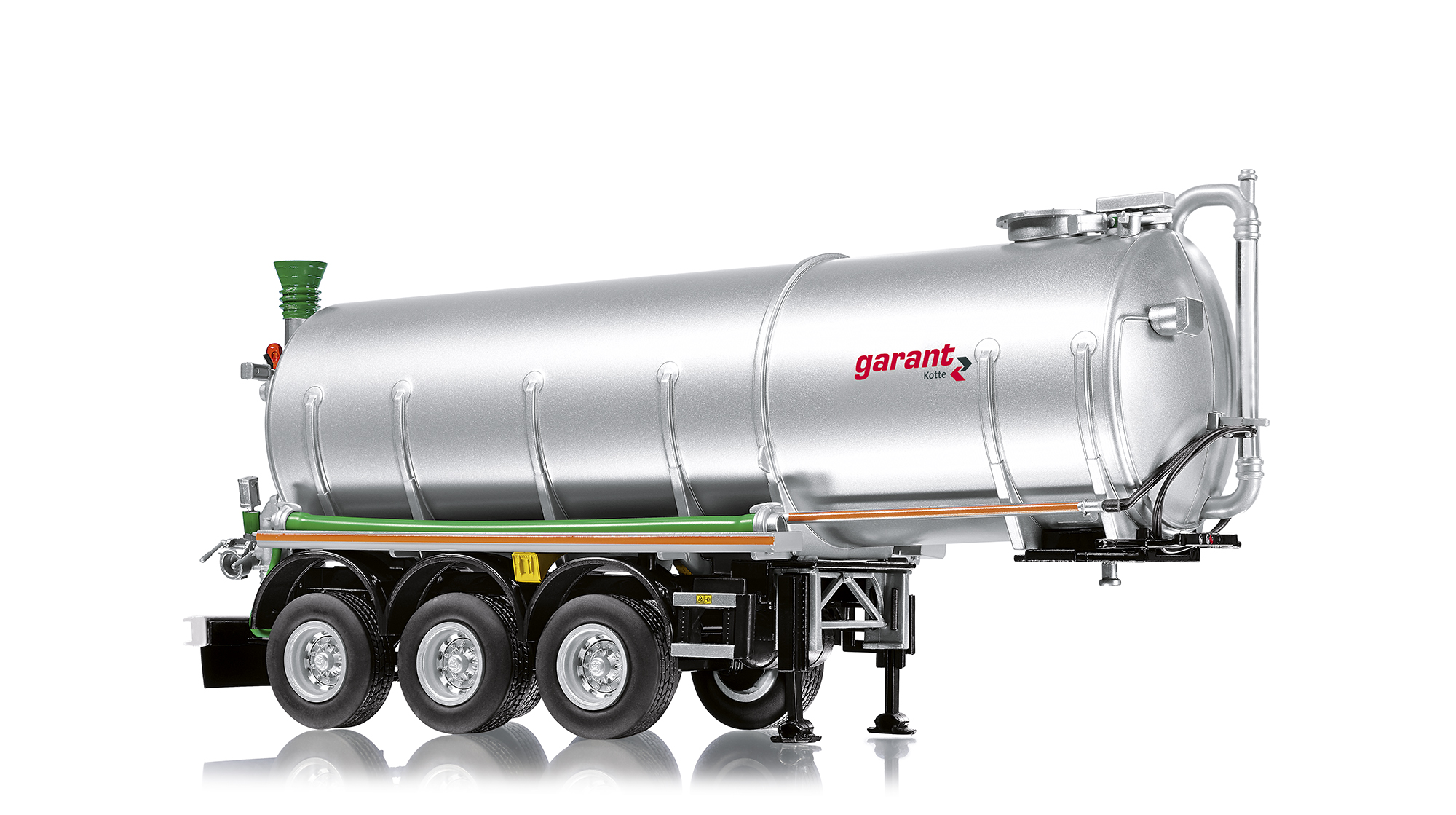 Da der Vakuumkompressor mit der patentierten Drehdurchführung mechanisch angetrieben wird, steht für die Befüllhilfe die komplette hydraulische Leistung der Zugmaschine zur Verfügung. Der Andocktrichter an der Rückwand ist so positioniert, dass das Ausbringfahrzeug die Gülle effizient überladen kann. Ein Pumpensumpf sorgt für eine vollständige Entleerung des Behälters. Rückwärtige Hinterachse lenkt vorbildgerecht mit Das 1:32-Modell entsteht in Handarbeit, zahlreiche Bauteile aus Zinkdruckguss und Kunststoff werden präzisionsgenau zusammengefügt. Im abgekoppelten Zustand kann der Tanksattelauflieger mühelos auf die ausziehbaren Stützen gestellt werden, sodass eine vorbildgerechte Alltagspräsentation möglich ist. Heckseitig können überdies die Kupplungsarmaturen zum Ablassen praxisgerecht geschwenkt werden. Genauso gut lässt sich das heckseitige Bedienpult öffnen und wieder verschließen. Um die vorbildgerechte Wendigkeit herzustellen, ist die Hinterachse lenkbar angelegt, die Achsen sind gefedert und die Funktion der Lift-Achse lässt sich nachvollziehen.