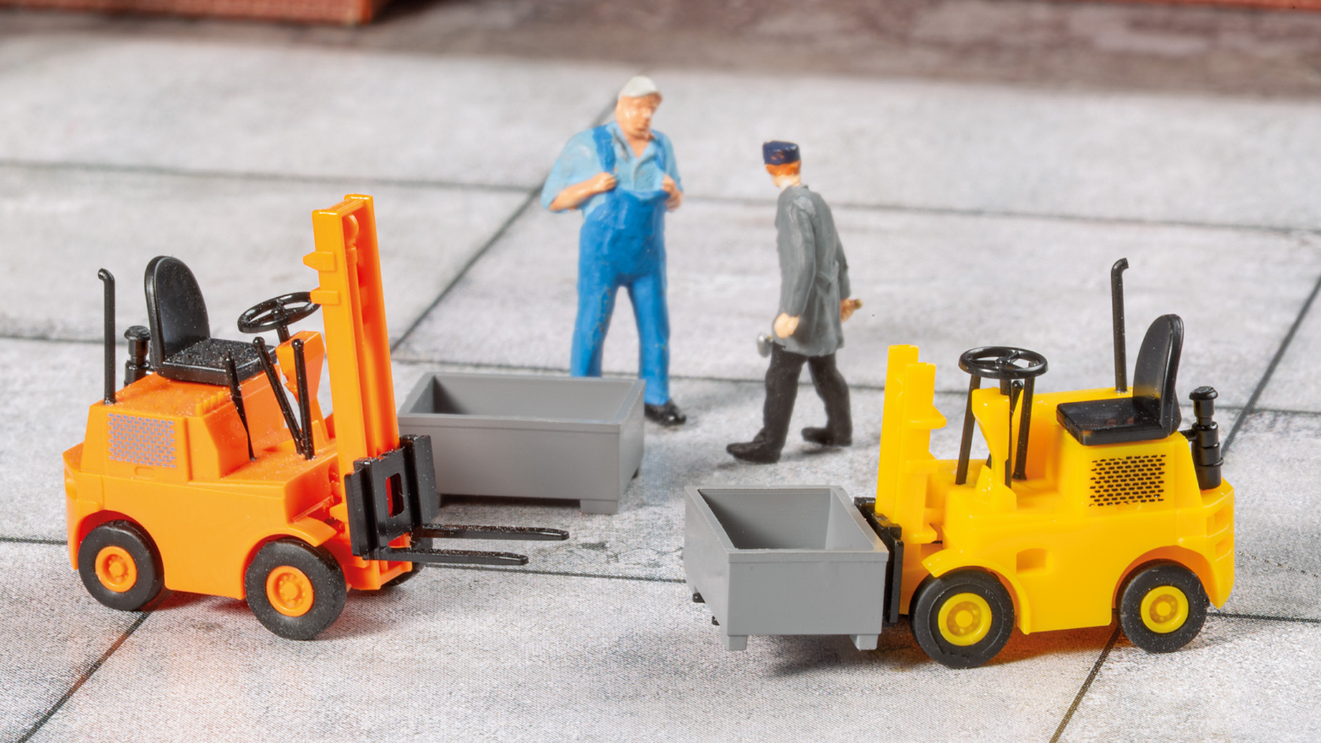 Filigranbausatz nach dem Vorbild des Dieselgabelstaplers DFG 1002 mit 1 t Tragkraft. Angetrieben von einem luftgekühlten Dieselmotor Typ 2 NVD 12,5 SRL mit 19 PS, ist er das typische Flurfördergerät für Stapeln, Be- und Entladen sowie den Transport von Paletten und Gitterboxen. Der Hubmast ist in zwei verschiedenen Längen neigbar und mit unterschiedlichen Gabelhöhen anbaubar. Paletten liegen bei und ermöglichen realistische Verladeszenen. Mit vorbildgerechter Bereifung, feiner Bedruckung und filigran nachgebildeten Bedienelementen.2 Gabelstapler 32 × 12 × 25 mm2 Transportkisten je 14 × 9 × 6 mm