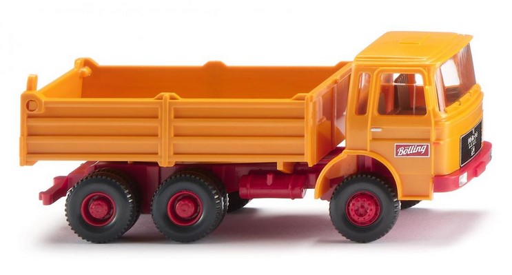 MAN-Baustellenkipper aus der Zeit der Büssing-Übernahme Der Fuhrpark des Revierunternehmens Bölling wächst weiter und ist längst zu einem Sympathie-Thema in der WIKING-Chronologie geworden. Die narzissengelben Baufahrzeuge mit ihren leuchtend roten Fahrgestellen zeigen die ganze Vielfalt jener Jahre. Der MAN-Frontlenker, der nach der Übernahme von Büssing auch den Braunschweiger Löwen am Kühlergrill trug, sorgt im Bölling-Fuhrpark für eine zeitgenössische Ergänzung. WIKING stattet das Baufahrzeug mit einem standardisierten Hochbordkipper aus. Fahrerhaus mit Hochbordpritsche, Kipphaken und Heckklappe narzissengelb. Fahrerhausunterteil, Fahrgestell mit Anhängerkupplung und Kardanteil karminrot. Inneneinrichtung blassbraun. Kühlergrill mit silbernem Rahmen und gesilberten MAN Diesel-Schriftzug sowie Büssing-Logo. Seitliche Blinker orange, Türgriffe gesilbert. Roter Bölling-Schriftzug auf den Fahrerhaustüren. Rote Rückleuchten