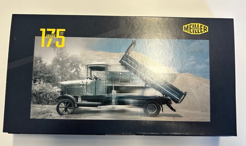 Das Set erinnert an die Modellhistorie mit drei Kipperaufbauten auf drei unterschiedlichen Herstellerfahrgestellen. Ältestes Vorbildfahrzeug ist ein Magirus 126 D 11 AK Eckhauber als Kurzpritschenkipper (0424). Die Aufbauten sind kieselgrau, Fahrgestell und Felgen sind rot. Ein resedagrüner MAN 26.281 Muldenkipper (0671) mit Stollenrädern ist das zweite Fahrzeug im Set. Auch hier sind Fahrgestell und Felgen rot ausgeführt. Auf einem oxidroten Fahrgestell baut der enzianblaue MB AK 2636 als Pritschenkipper (0674) auf. Alle drei Modelle sind mit Meiller-Logos bzw. Schriftzügen auf den Kippaufbauten bedruckt.