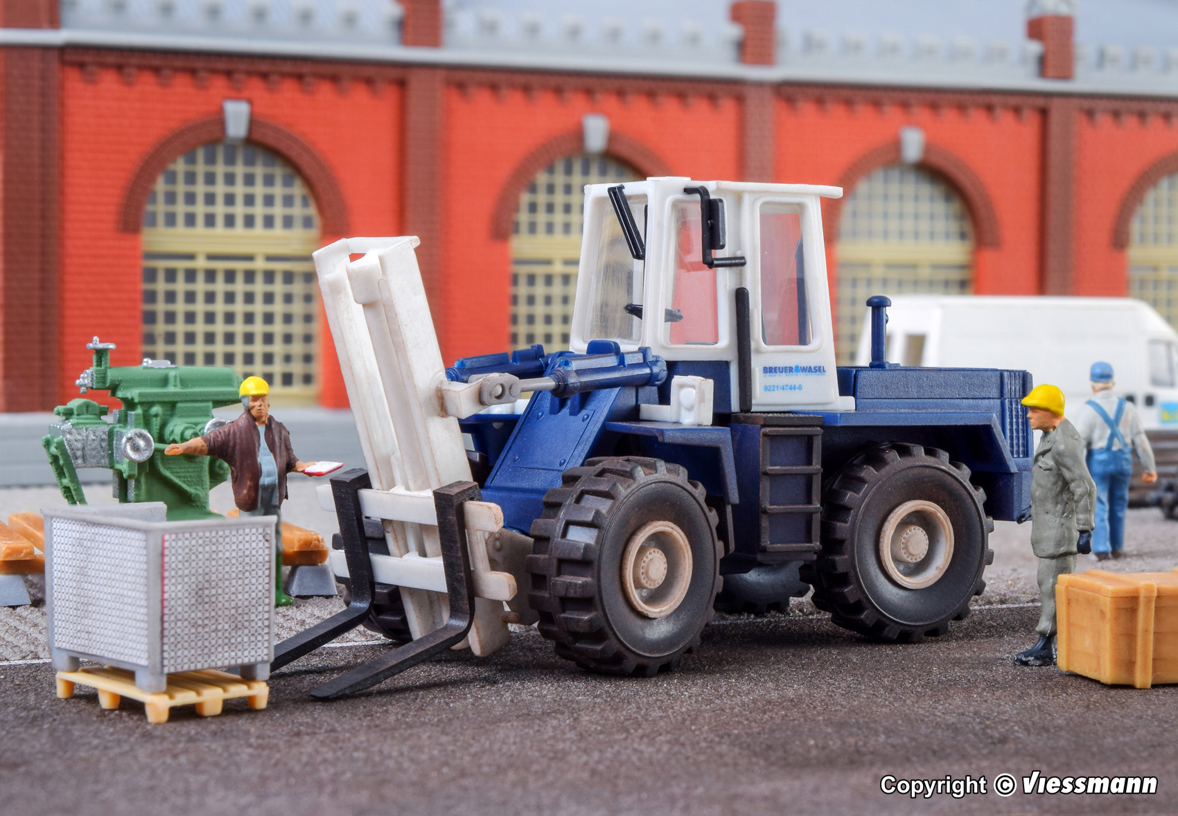 Bausatz. Vorbilddaten: Ursprünglich für den Einsatz beim ehemaligen Bundesgrenzschutz bestimmt, gelangte das sogenannte Feldumschlaggerät auf Basis eines O&K-Radladers in den Fuhrpark der Firma BREUER KRANE bzw. des Nachfolgeunternehmens BREUER & WASEL. Dort wurde der geländegängige Stapler zur Unterstützung bei Montage und Betrieb der Raupenkräne genutzt. Das Modell ist mit hochwertiger Tampon-Bedruckung versehen. L 7,7 x B 2,7 x H 3,6 cm. Schwierigkeitsgrad: 2 (Fortgeschrittene).