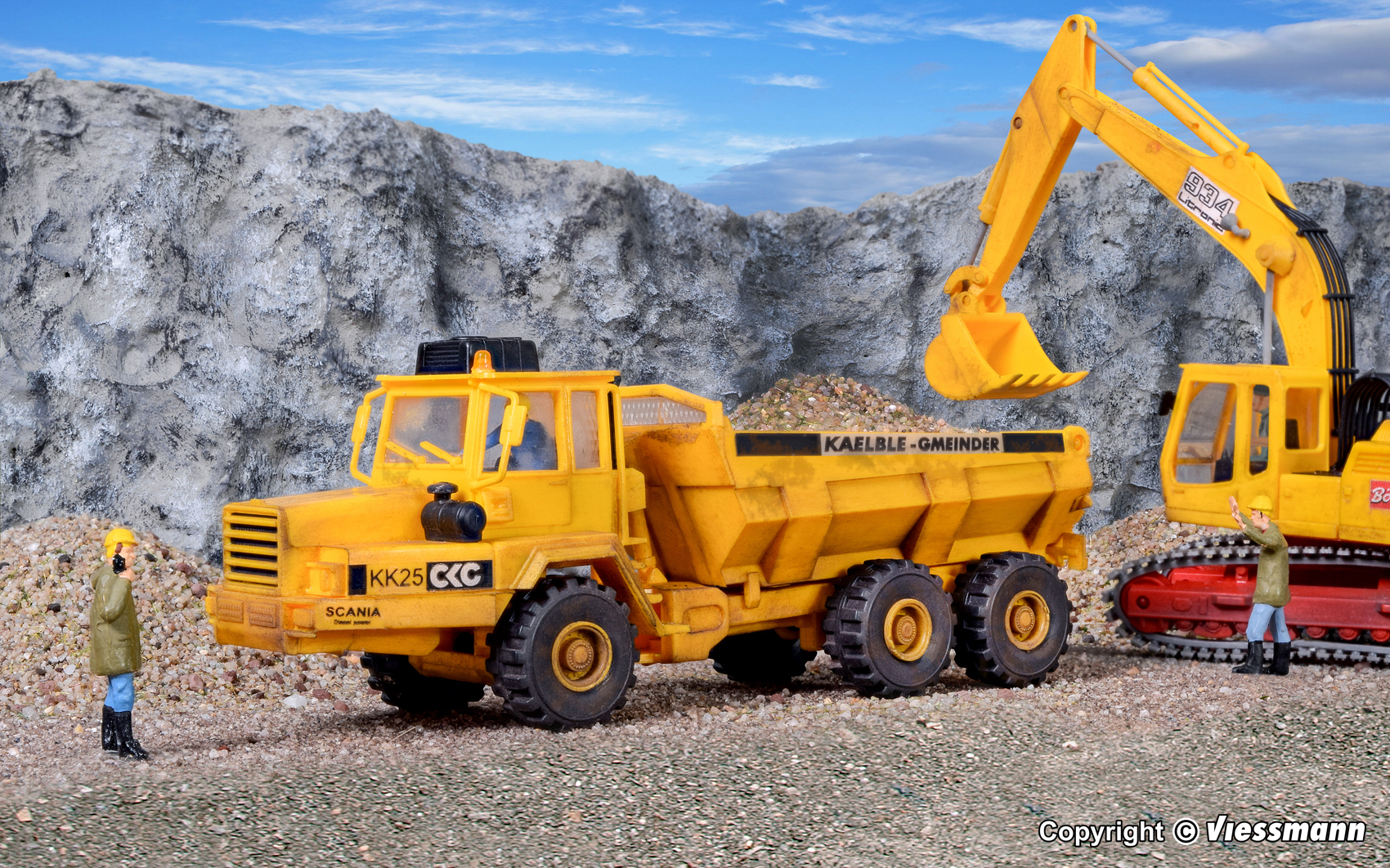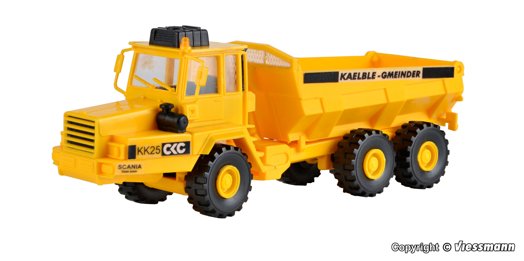 Bausatz. Vorbilddaten: Der KAELBLE-GMEINDER Knicklenker KK 25, auch Dumper genannt, ist ein allradgetriebener Muldenkipper mit hohem technischen Standard. Angetrieben durch einen 6 Zylinder Dieselmotor von SAAB-SCANIA mit einer Leistung von 190 kW/259 PS ist der Dumper das universelle Transportfahrzeug für jedes Gelände. Bei einem Gesamtgewicht von 41 t können in der beheizbaren Kippmulde 15,5 m³ Ladung transportiert werden. Die Lenkung erfolgt hydrostatisch durch 2 am Knickgelenk wirkende Hydraulikzylinder. Die Höchstgeschwindigkeit liegt bei 53 km/h. Beim Einsatz im Gelände, beim Transport auf Baustraßen, Laden oder Auskippen werden die Vorteile gegenüber herkömmlichen LKW deutlich sichtbar. Maße: L 11,2 x B 3 x H 4 ? 7 cm. Schwierigkeitsgrad: 2 (Fortgeschrittene).