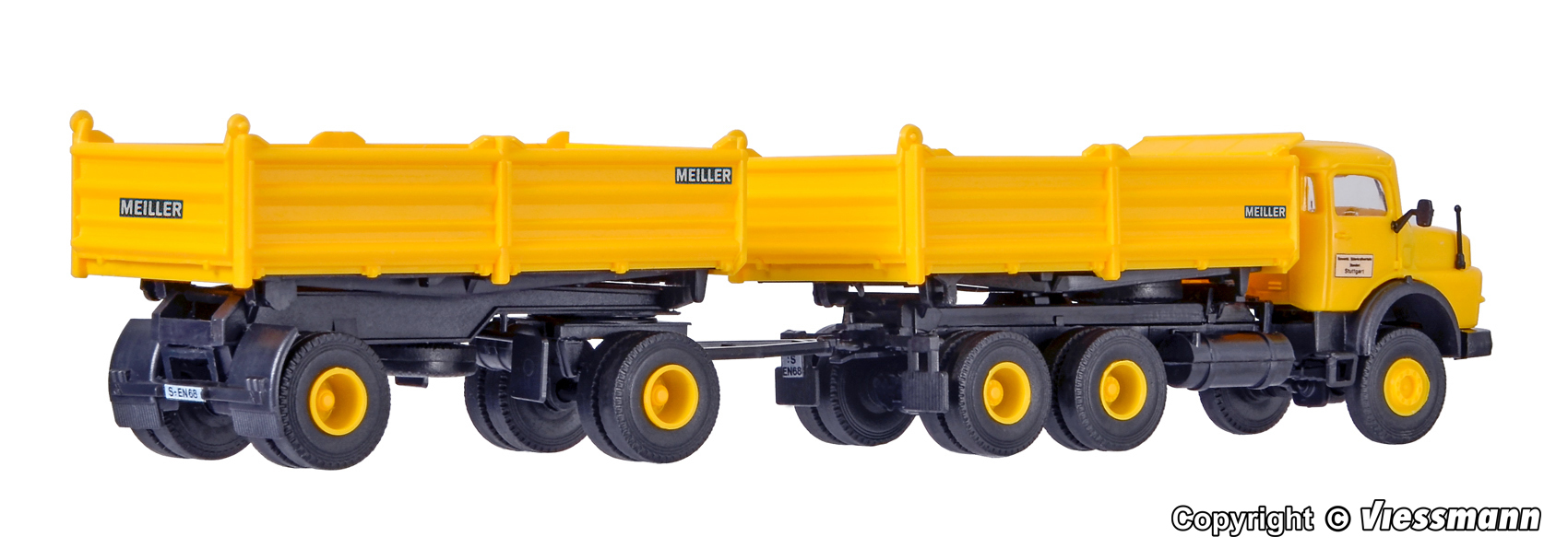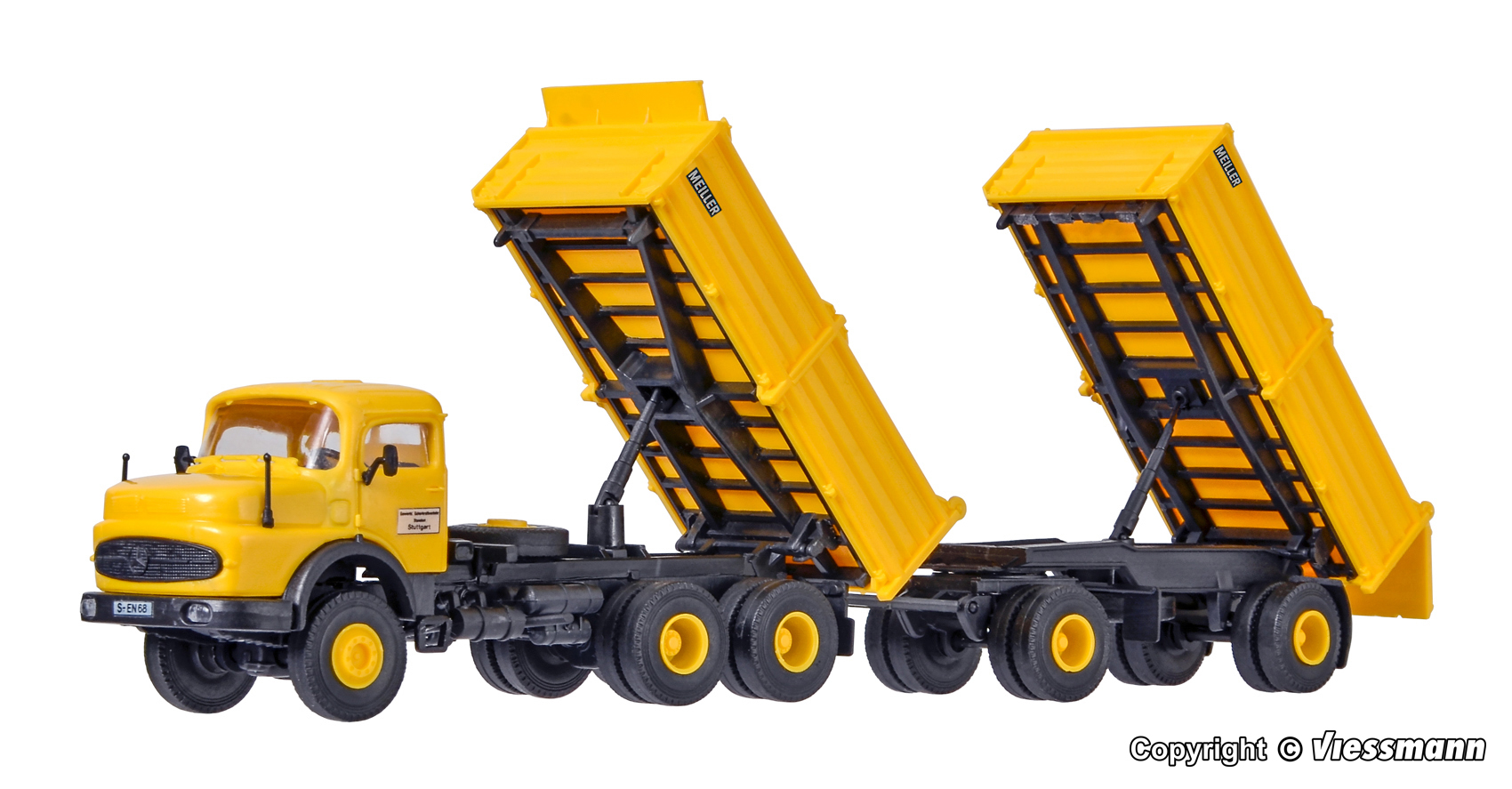 Bausatz. Vorbilddaten: MERCEDES-BENZ LAK 2624, 177 kW/240 PS Dieselmotor mit MEILLER Kippaufbau, Nutzlast ca. 15 t, Gesamtgewicht 26 t. MEILLER Kippanhänger MZKA 28/2, Nutzlast bis 21 t, Gesamtgewicht bis 28 t. Maße: L 16,5 x B 3,5 x H 3,2 ? 6,8 cm. Schwierigkeitsgrad: 2 (Fortgeschrittene).