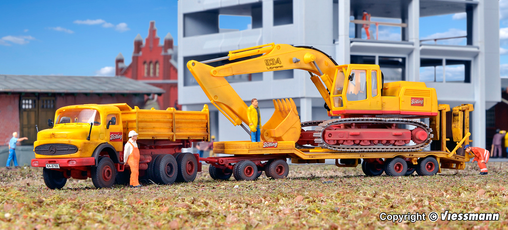MB Kurzhauber mit Tiefladeanhänger, Edition Emil Bölling. Maße: L 22-25,5 x B 3,5 x H 3,3-6 cm. Passende Beladung: Liebherr Litronic R934, Edition Emil Bölling. Schwierigkeitsgrad: 2 (Fortgeschrittene).