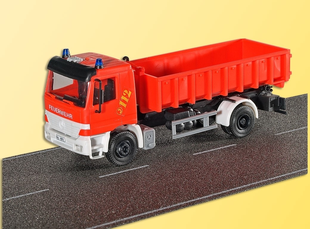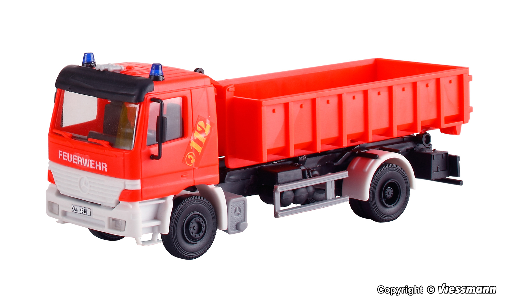 Bausatz. Vorbilddaten: MB ACTROS Typ 2531, 230 kW/313 PS, MEILLER Abrollhaken RK 13.55/RK 19.55, Muldeninhalt ca. 15 m³. Maße: L 10 x B 3,2 x H 4 cm. Schwierigkeitsgrad: 2 (Fortgeschrittene).
