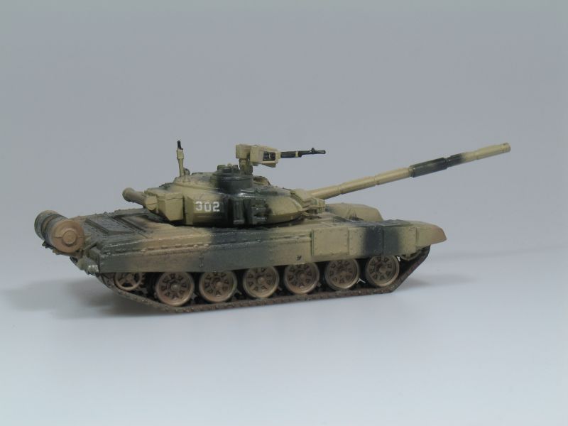 Bausatz eines Kampfpanzers T-90. Der Bausatz enthält eingefärbte Bauteile aus Kunststoff und Abziehbilder für die Beschriftung.