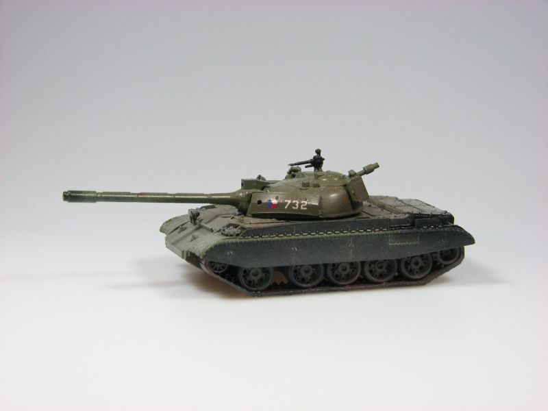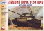 Bausatz eines Kampfpanzer T-54AM2. Der Bausatz enthält eingefärbte Bauteile aus Kunststoff und Abziehbilder für die Beschriftung.