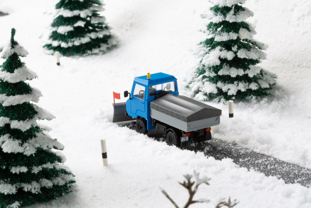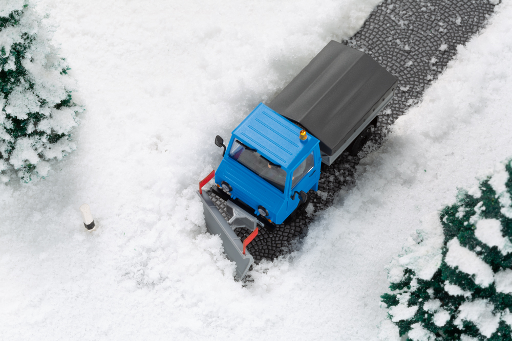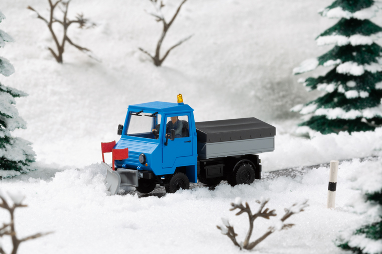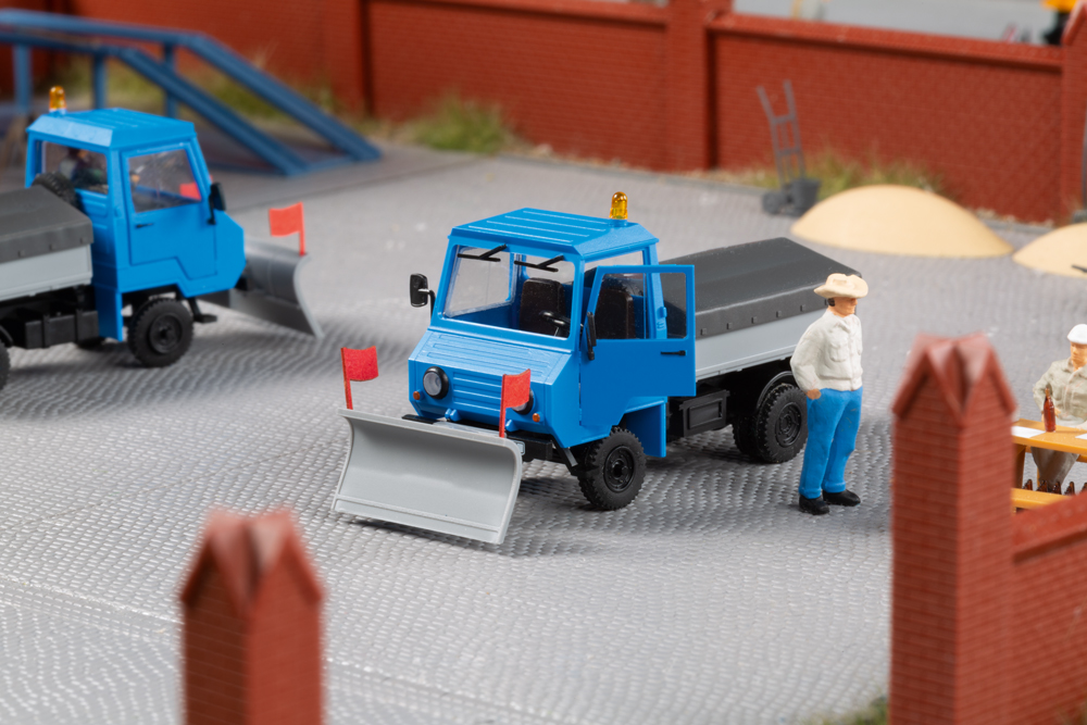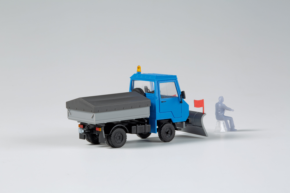 Bausatz. Fein detailliertes Modell des Multicar M24-0. Vielfältige Anbaugeräte machten den Multicar M24 mit Doppelkabine universell einsetzbar. Das maßstäbliche Fahrzeug mit Schiebeschild hilft im Winter Verkehrswege schneefrei zu halten. Die Lampenzierringe, die Blinker und Rückleuchten, die Türgriffe und die Kennzeichen sind aufwendig mehrfach bedruckt. Offen darstellbare Türen, eine Motorattrappe, vorbildgerechte beschriftete Bereifung auf korrekt nachgebildeten Felgen und Rollfähigkeit zeichnen das komplett neu konstruierte Modellfahrzeug aus. Die Achswellen sind aus geschwärztem Stahl. Ein Druckbogen mit alternativen Kennzeichen liegt bei. Inklusive sitzender Figur.