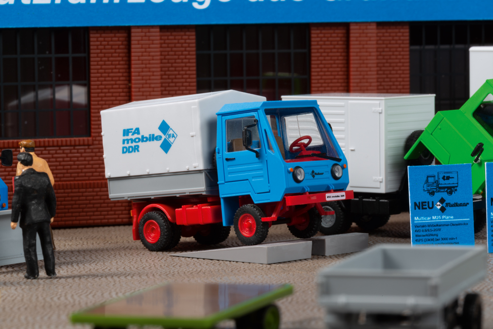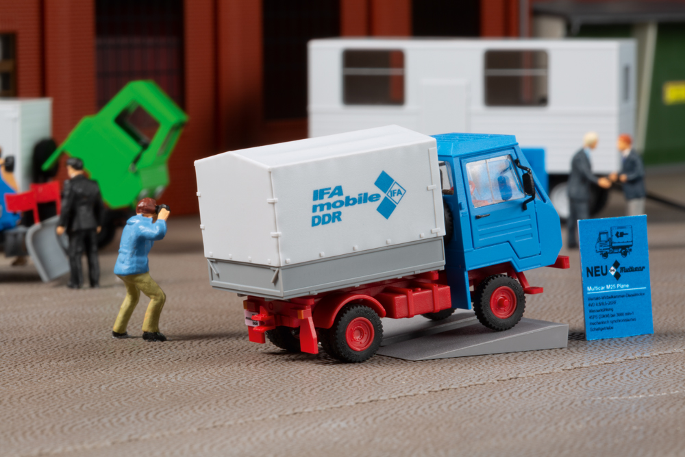 Bausatz. Fein detailliertes und maßstäbliches Modell des Multicar M25. Mit seinem neuen Fahrerhaus wird der M25 mit Plane auf der Leipziger Messe 1978 als Neuheit ausgestellt und mehrfach ausgezeichnet. Das IFA-Logo sowie die Lampenzierringe, die Rückleuchten, die Türgriffe und die Kennzeichen sind aufwendig mehrfach bedruckt. Offen darstellbare Türen, eine Motorattrappe, vorbildgerechte beschriftete Bereifung auf korrekt nachgebildeten Felgen und Rollfähigkeit zeichnen das komplett neu konstruierte Modellfahrzeug aus. Die Achswellen sind aus geschwärztem Stahl. Ein Druckbogen mit alternativen Kennzeichen liegt bei. Inklusive sitzender Figur.